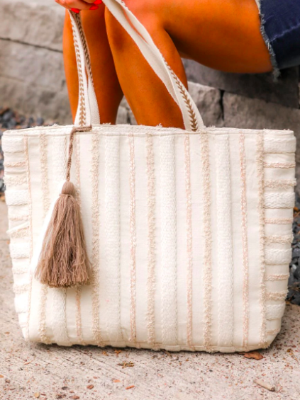 Get vacay ready with our summer-approved tote featuring a removable two-toned tassel, canvas material, zipper closure, and two open interior pockets.