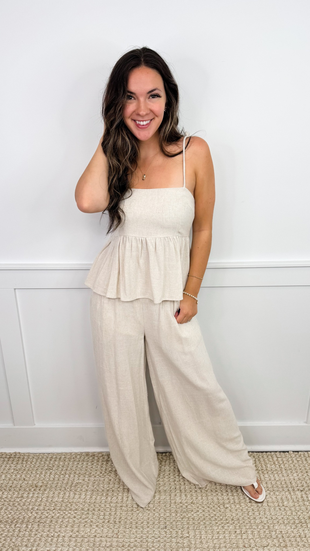 Embrace breezy comfort with this lightweight oatmeal cropped tank, featuring a soft linen feel that’s perfect for sunny days. Playfully designed with tie shoulder straps and a smocked back, it offers an adjustable fit that moves with you. Light and airy, it’s your go-to top for effortless style and all-day ease.