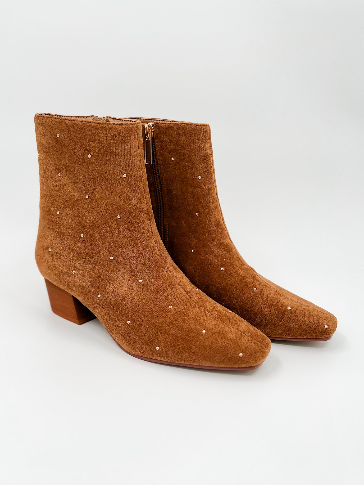 Step into style and comfort with the Corkys In a Rush Faux Suede Booties! Featuring a trendy stacked heel and a comfy footbed, these booties keep you looking and feeling great all day. The chic square toe and easy side zip add effortless flair, while the playful dot studs bring just the right touch of sparkle to your outfit. Perfect for adding a dash of fun to any look!