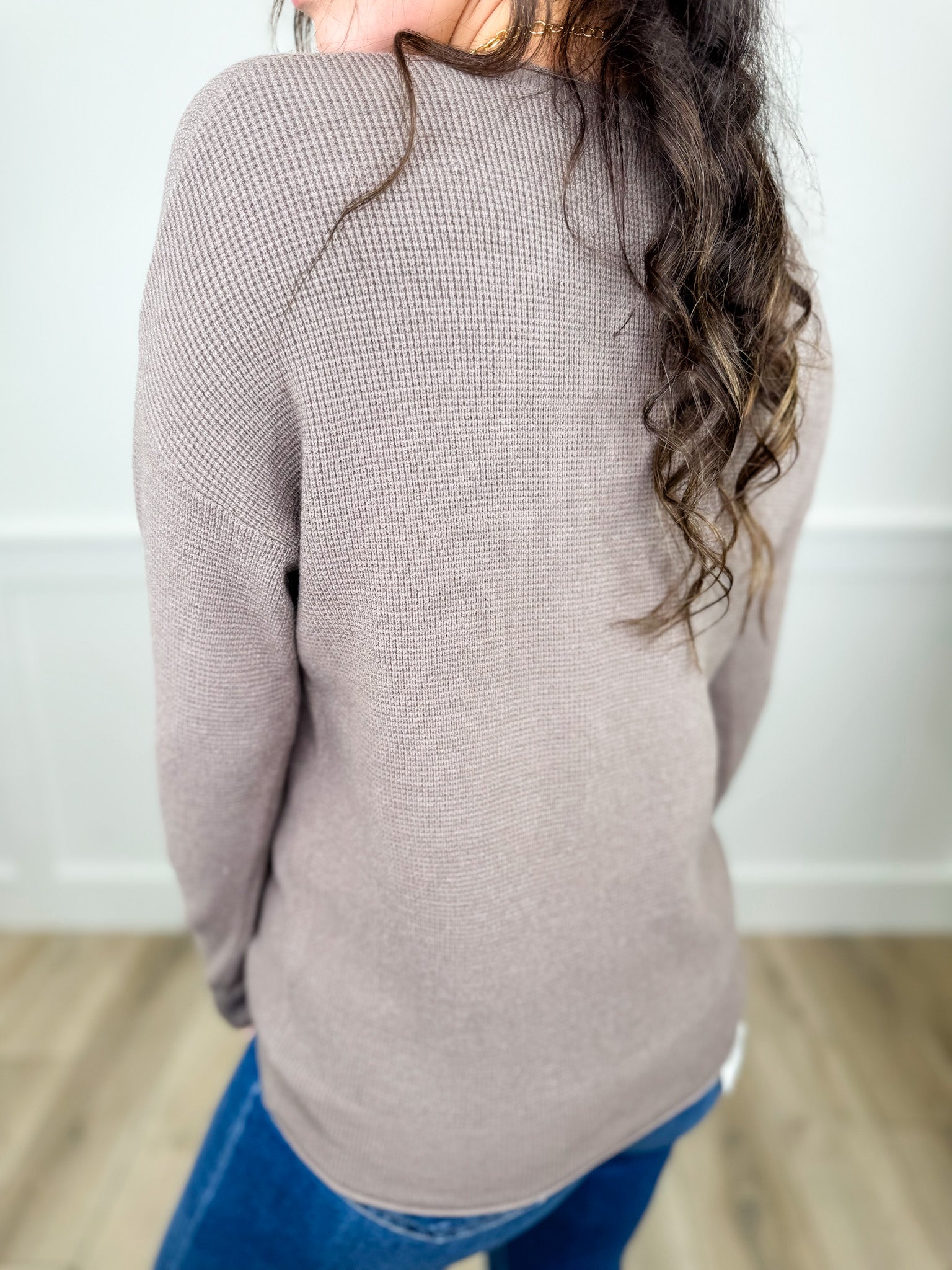 Cozy up in the Embrace The Process Knit Sweater, designed with a playful waffle texture that’s as soft as a hug. Its long sleeves and convenient chest pocket add charm and function, making it your new go-to for relaxed days. Embrace comfort and style effortlessly with this taupe treasure.