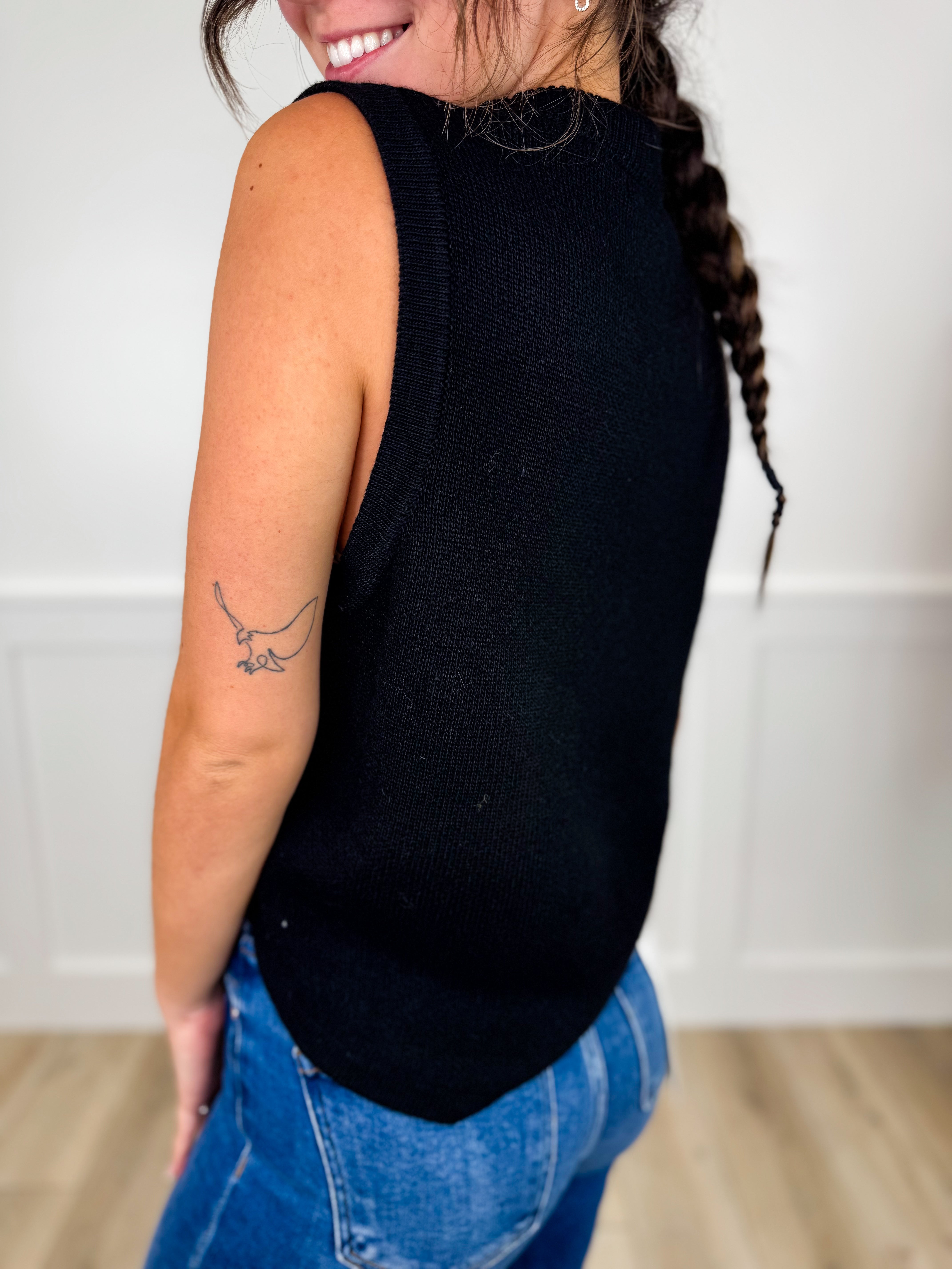 Stay effortlessly chic with the In Real Time Knit Black Avery Mae Mom Cropped Top. This sleeveless sweater features a flattering mom cropped fit and a trendy mock neck, finished off with eye-catching gold buttons. Perfect for layering or wearing solo, it adds a playful touch to your wardrobe while keeping things cool and stylish.