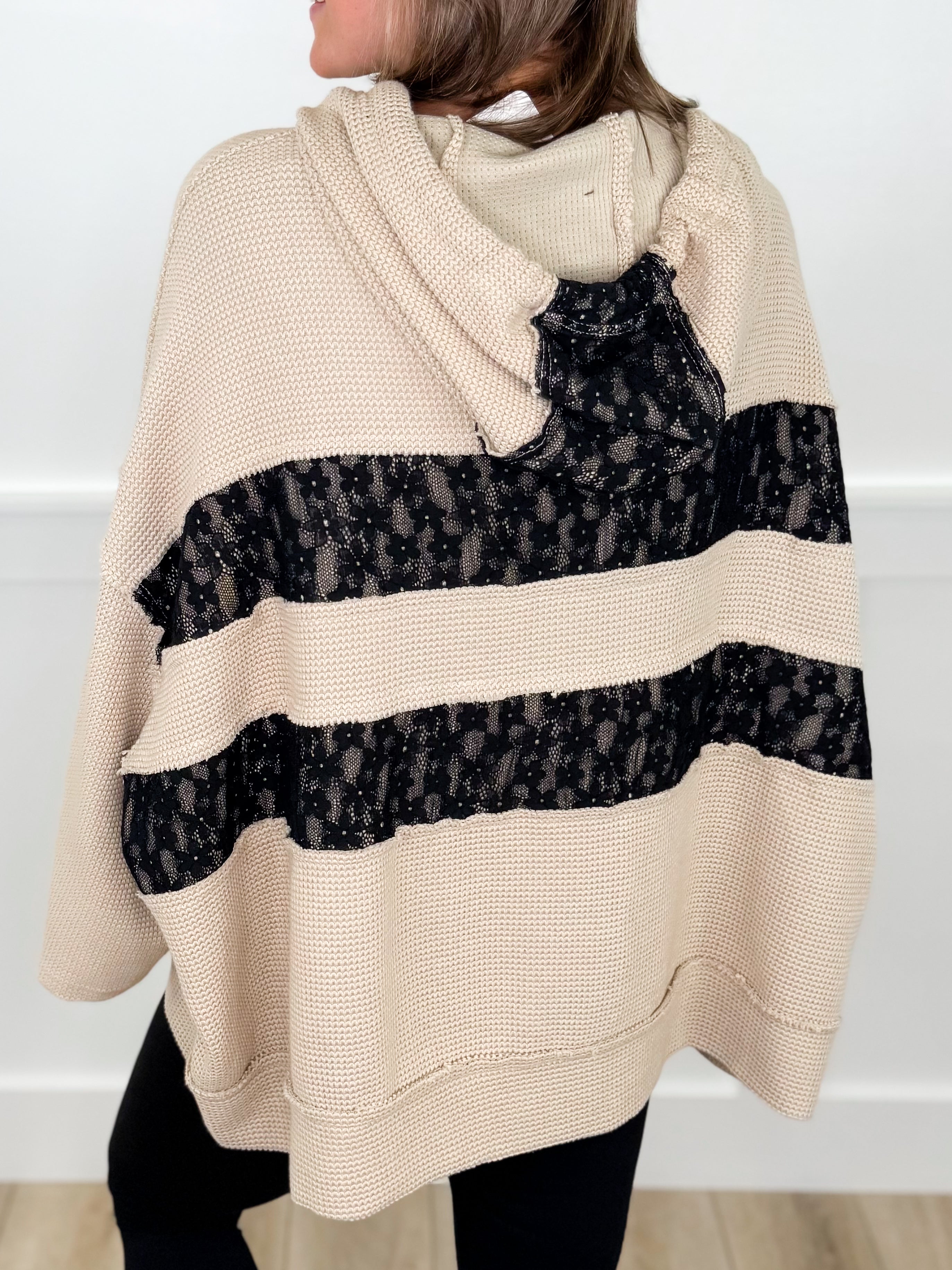 Step up your style game with the POL On My Level Cotton 3/4 Sleeve Tan Hooded Poncho Top. Featuring a cozy oversized fit and black lace accents, this top adds a flirty twist to casual comfort. The braided hood drawstrings bring a playful touch, making it perfect for layering or lounging in effortless chic.