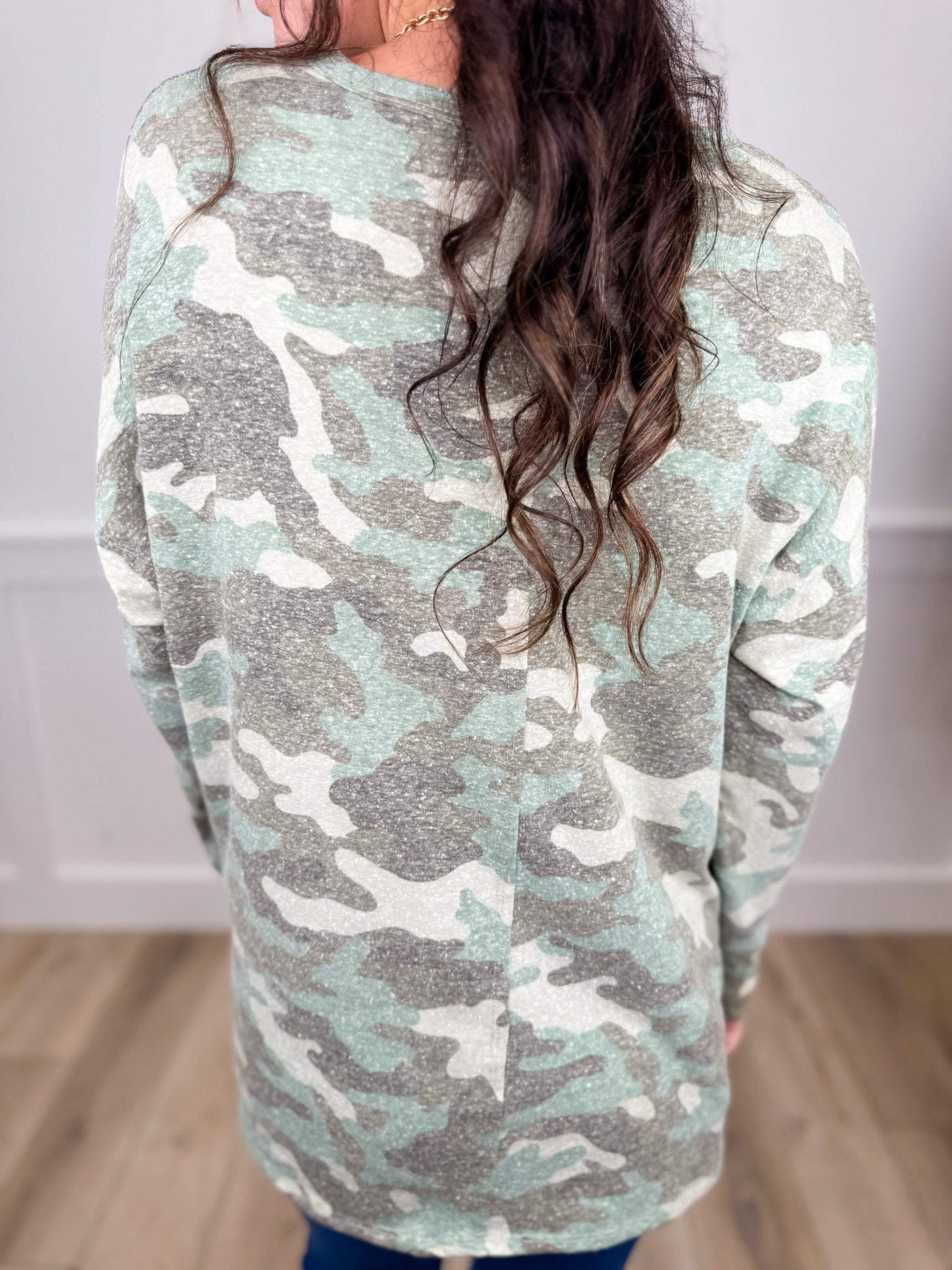 Bring a fresh twist to your casual look with the Sew In Love Be Real Long Sleeve Green Top. Its heathered green camo pattern adds a playful edge, while the cozy long sleeves keep you comfy all day. A handy pocket adds a touch of practicality, perfect for tucking away small essentials as you go about your adventures. This top blends fun and function effortlessly!