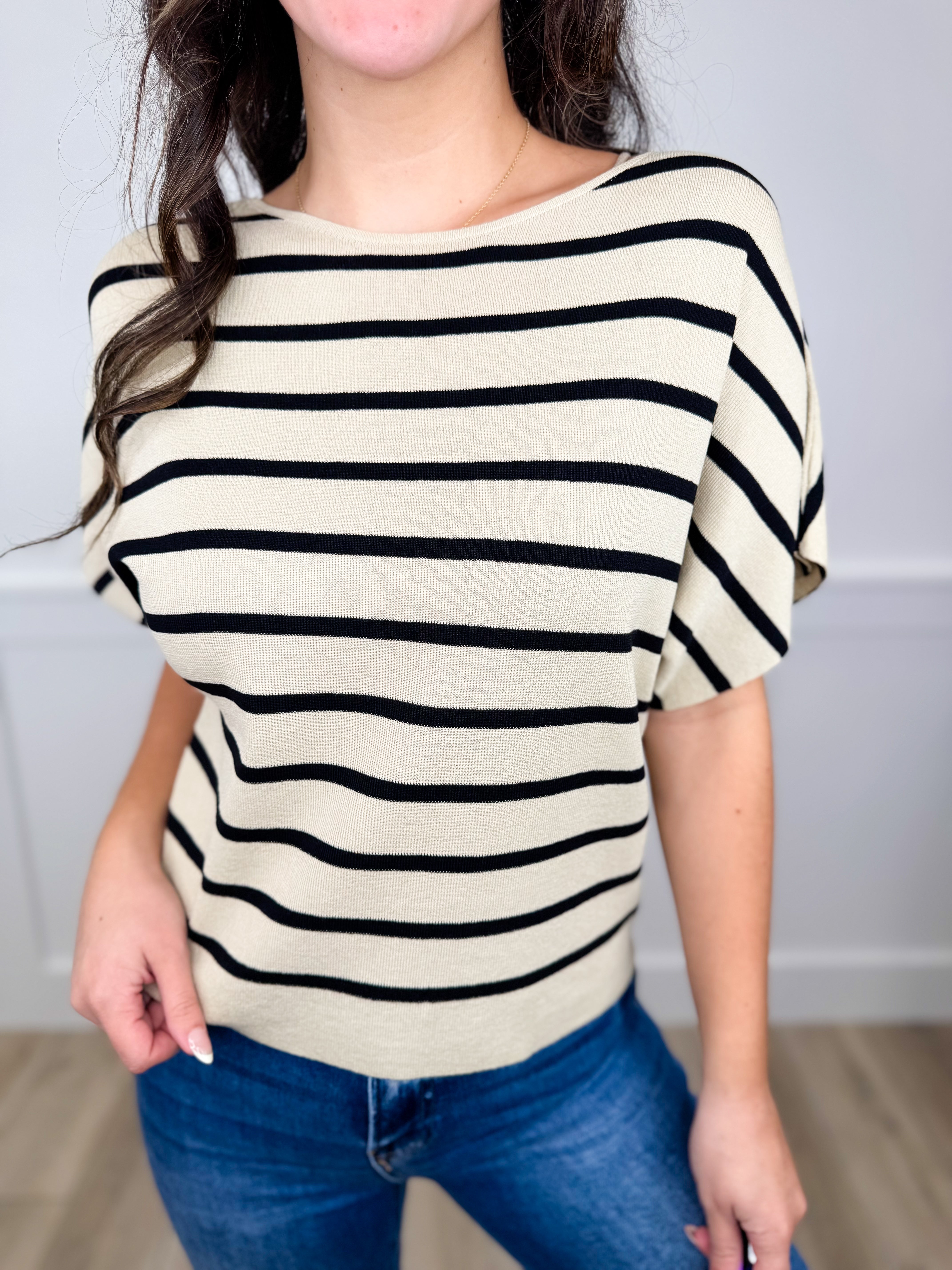 Add a playful touch to your wardrobe with the Sew in Love Call Me Out Short Sleeve Top. Featuring bold horizontal black stripes and a chic boat neck, this top effortlessly blends classic style with a fun twist. Perfect for casual days or dressed-up occasions, it’s a versatile piece that brings both comfort and character to your outfit.