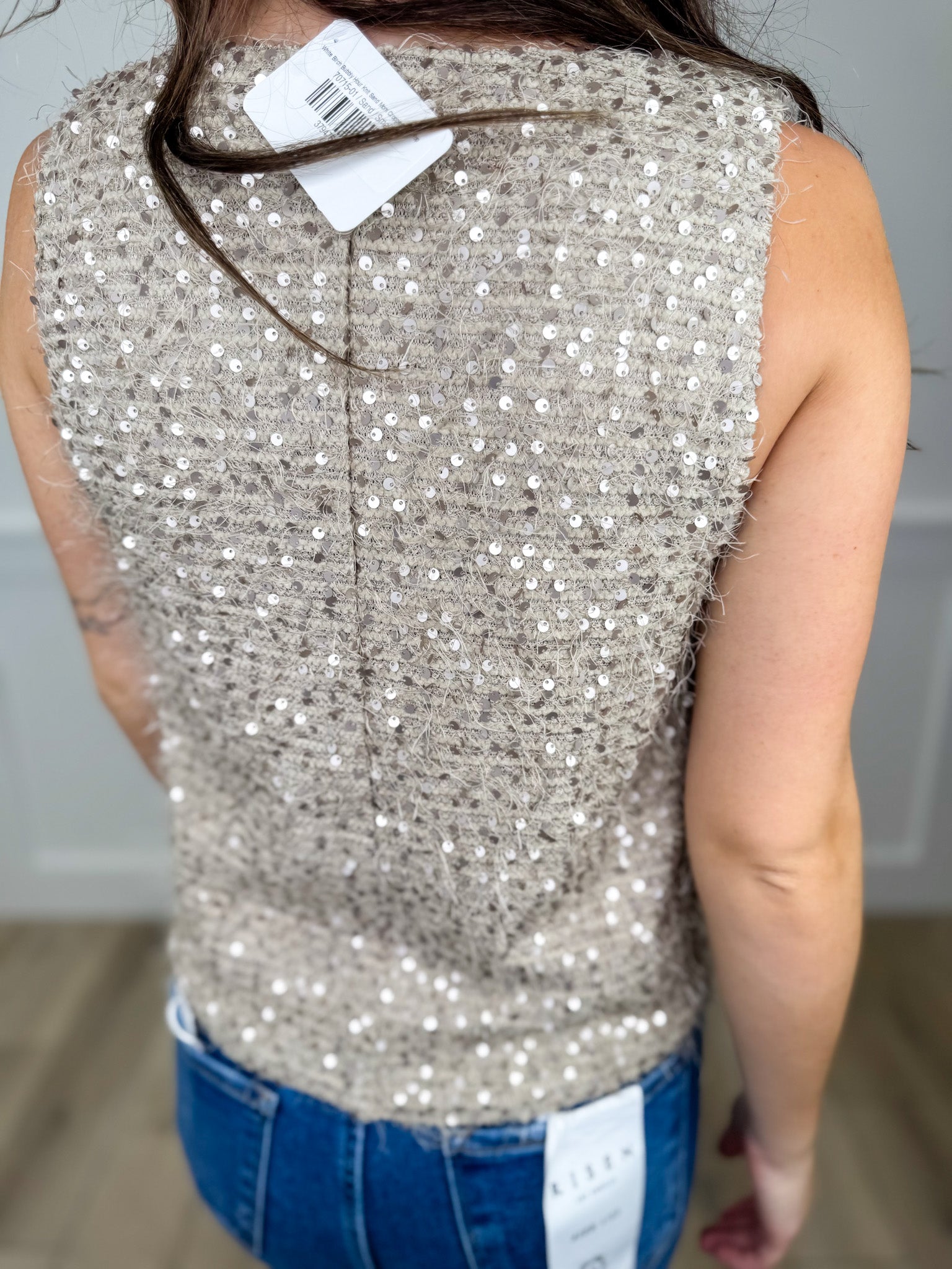 This sand-colored cropped tank top sparkles with champagne sequins for a fun and fresh twist. Featuring a flattering V-neck, it’s perfect for adding a little sparkle to your casual look or dressing up for a playful night out. Lightweight and stylish, it’s a bubbly way to brighten your day!