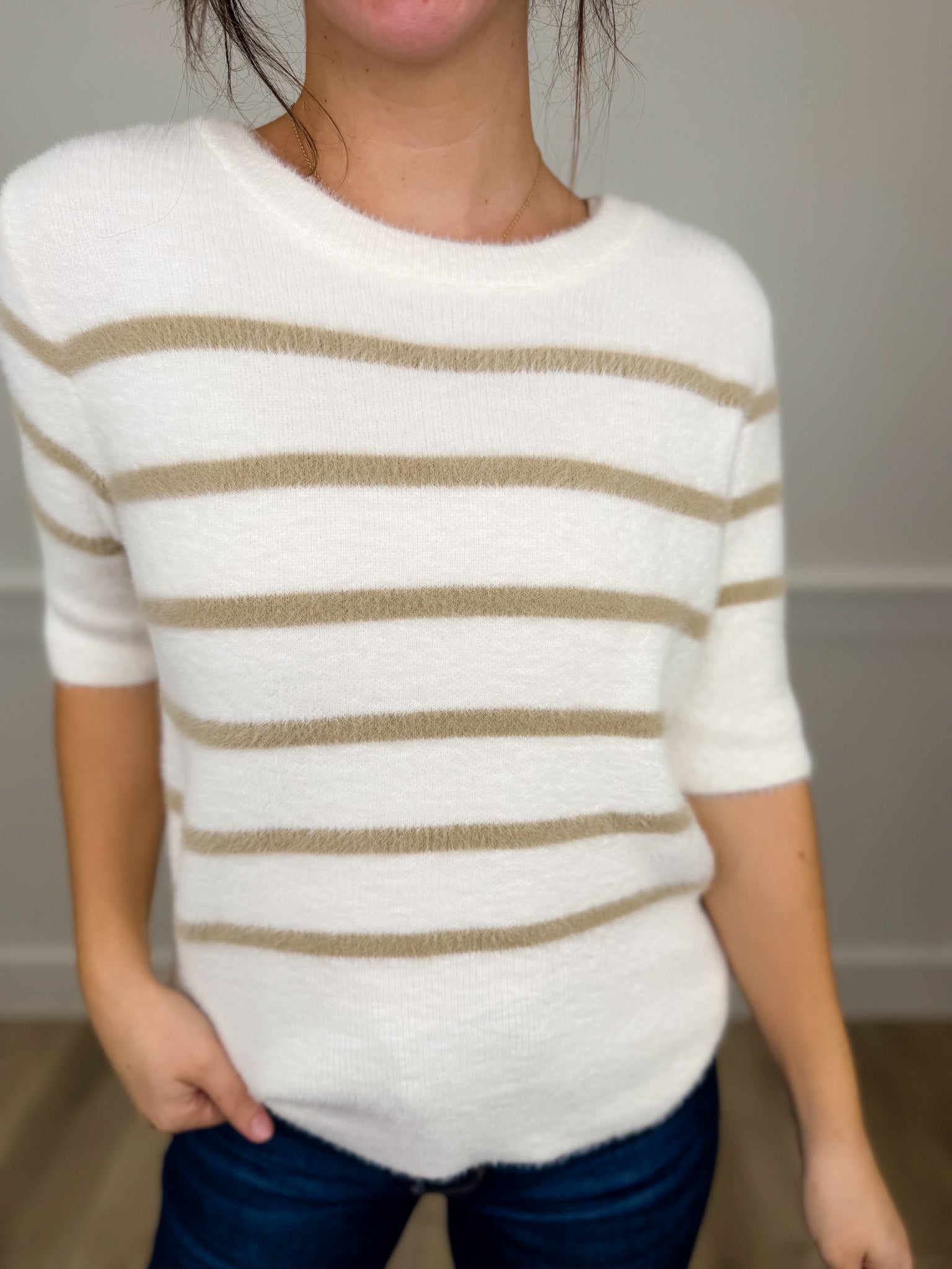 Stay cozy and chic in this White Birch knit sweater. Featuring 3/4 sleeves and a round neckline, its soft cream fabric is playfully accented with subtle tan stripes. Perfect for effortless style and comfort all day long!