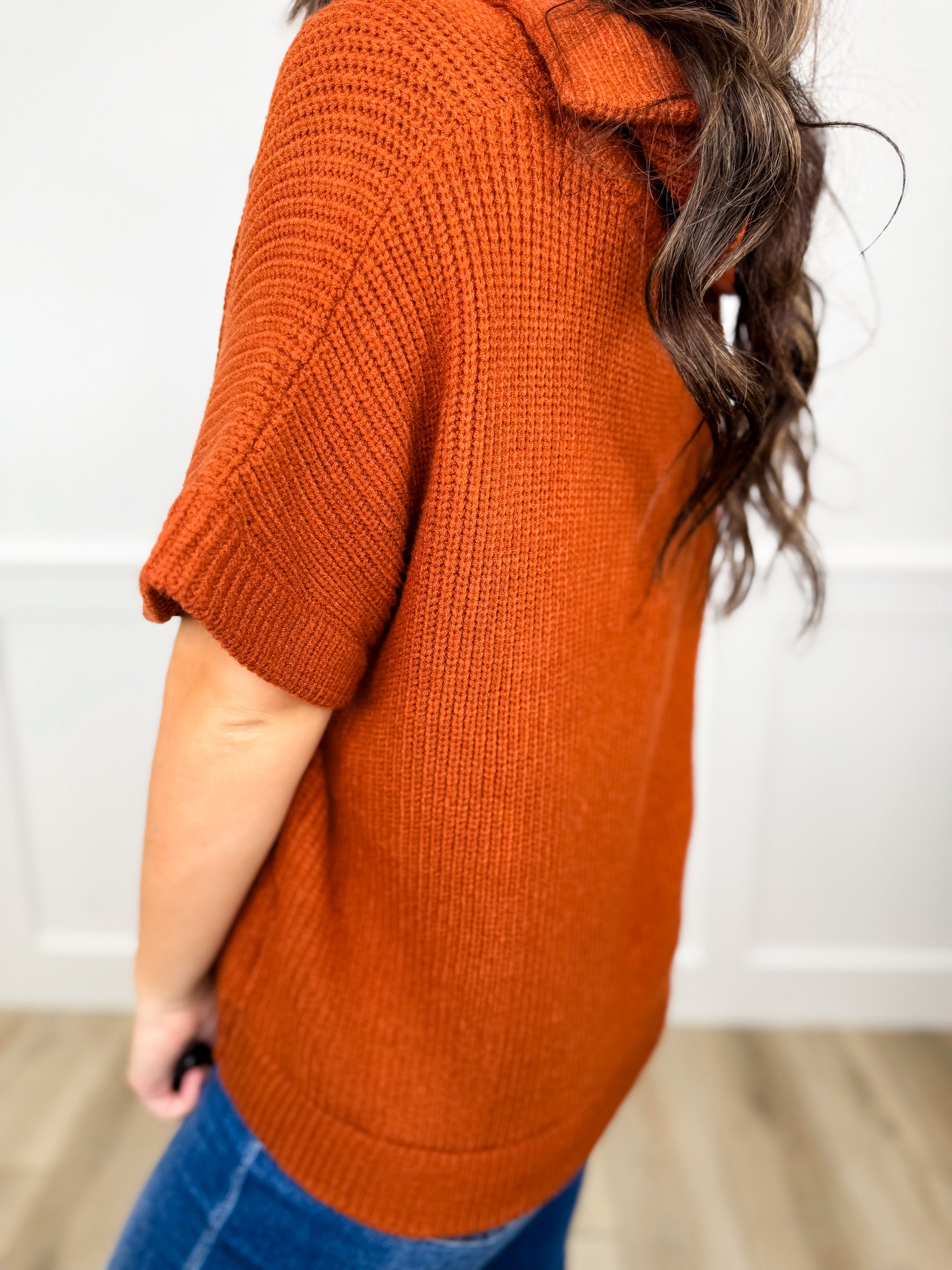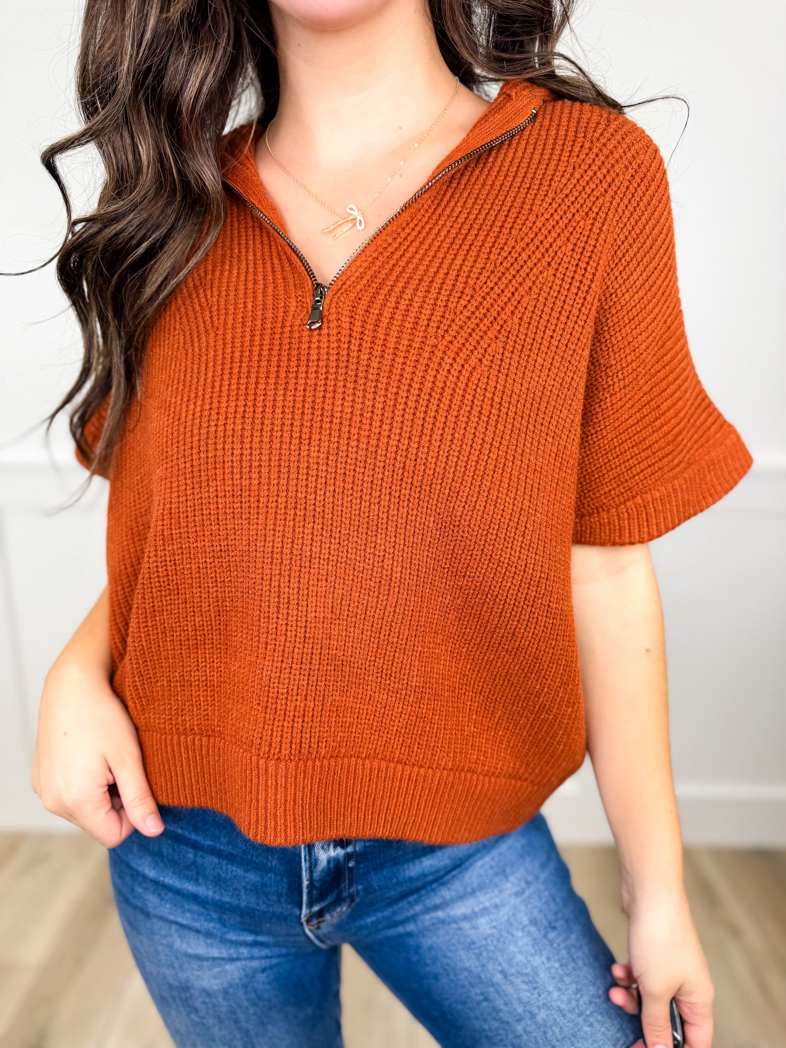 Elevate your look with the Wishlist See You Later Knit Short Sleeve Sweater Top. Featuring a daring split neck with a zipper and a sleek collar, this rust-colored knit delivers bold style and effortless edge. Perfect for those who aren’t afraid to stand out.