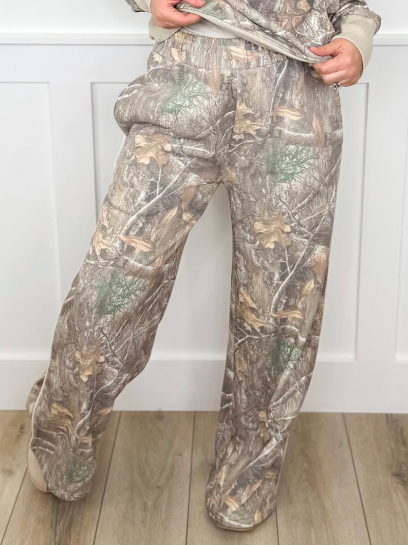 Get ready to turn heads in these playful high-rise wide leg camo pants! Featuring an adjustable inside drawstring for your perfect fit and handy pockets to keep your essentials close, these bottoms blend comfort with cool effortlessly. Whether you're out exploring or just lounging, they’re ready to go whenever you are.