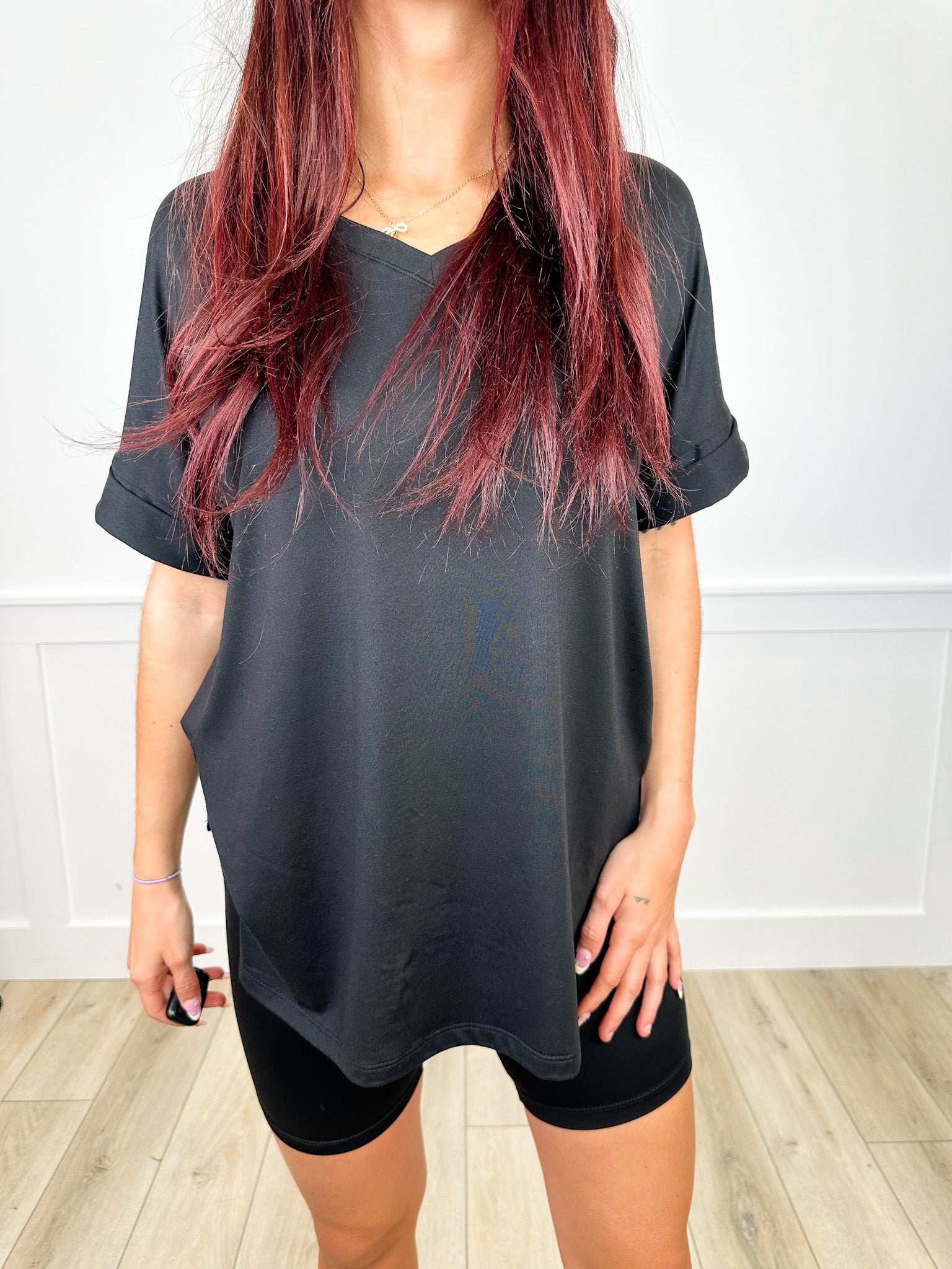 Effortless comfort meets laid-back style with this two-piece set that's basically your new uniform. Pair the oversized short-sleeve v-neck top with matching biker shorts for an instantly put-together look that requires zero effort. Perfect for lounging, running errands, or those days when you want to look cute without trying. Available in six versatile colors to match your mood. Simple, comfortable, and always in style.