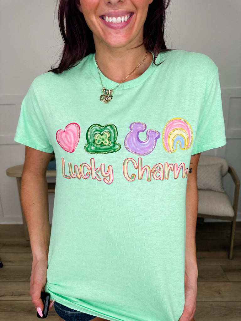 Embrace your lucky side with this playful mint green tee featuring an iconic Lucky Charms graphic. Perfect for St. Patrick's Day celebrations or year-round charm, this soft cotton short sleeve shirt brings a nostalgic, whimsical vibe to your casual wardrobe. Comfortable enough for everyday wear, it's a fun conversation starter that celebrates the magic of good fortune and childhood favorites.