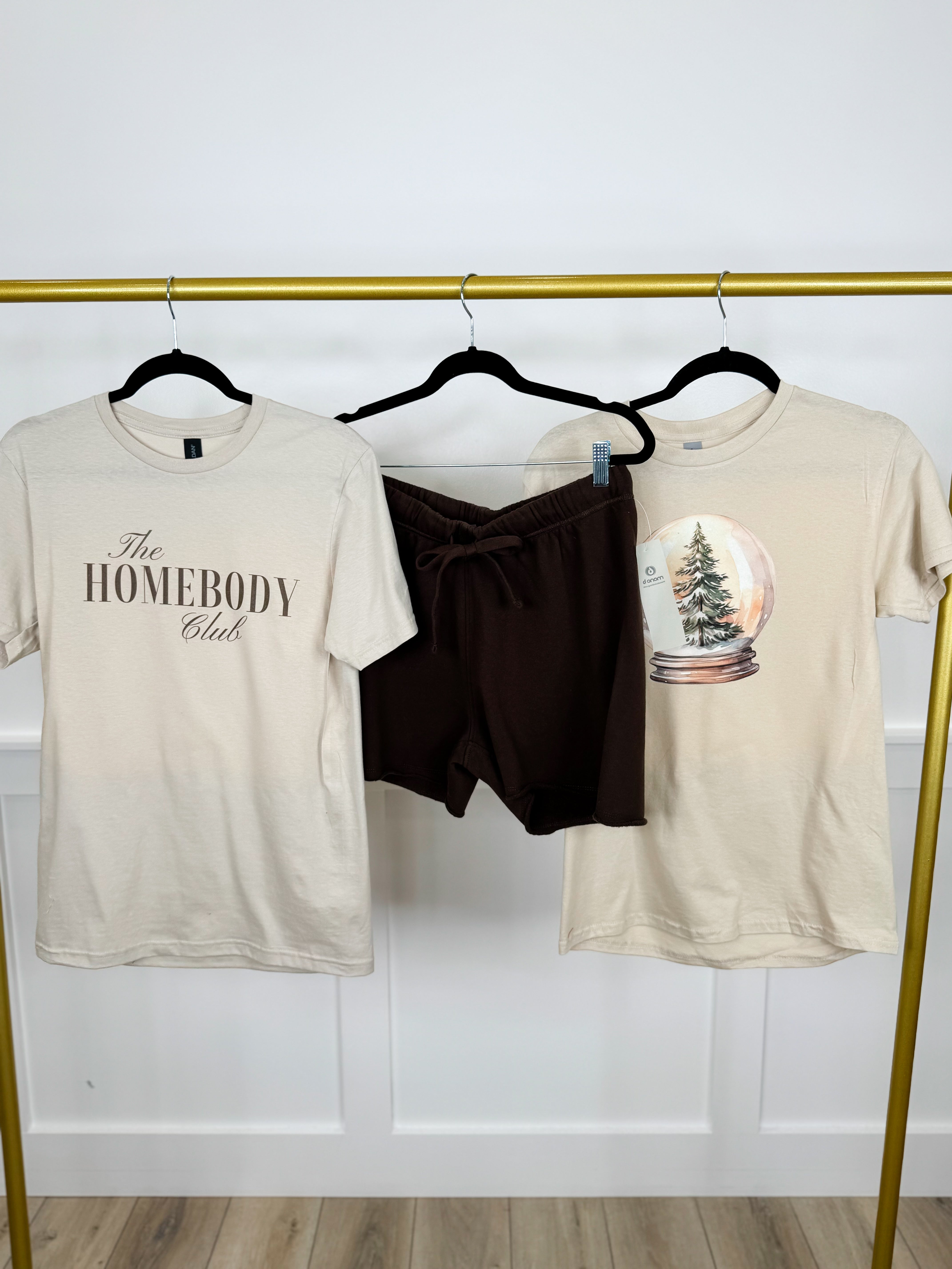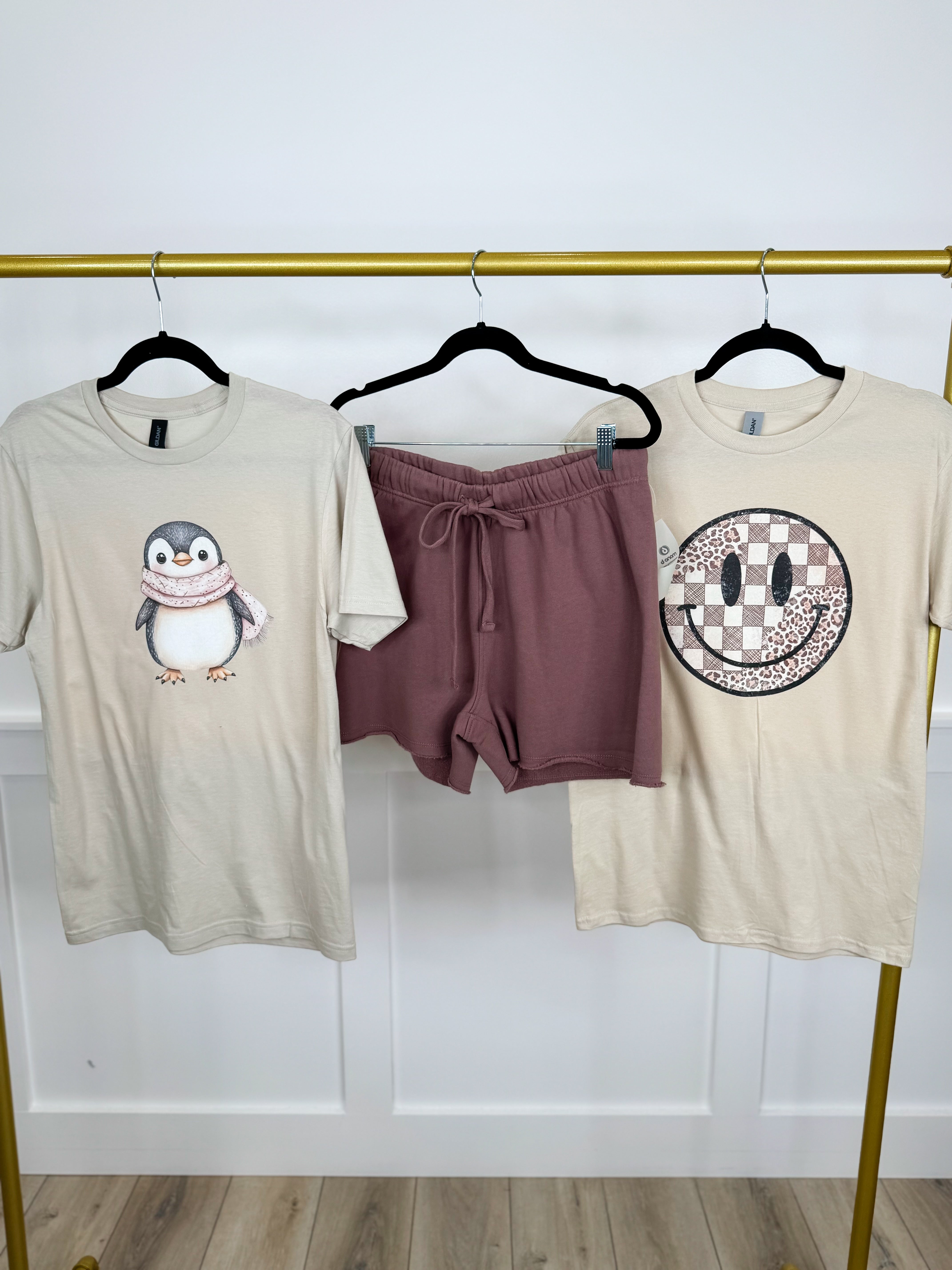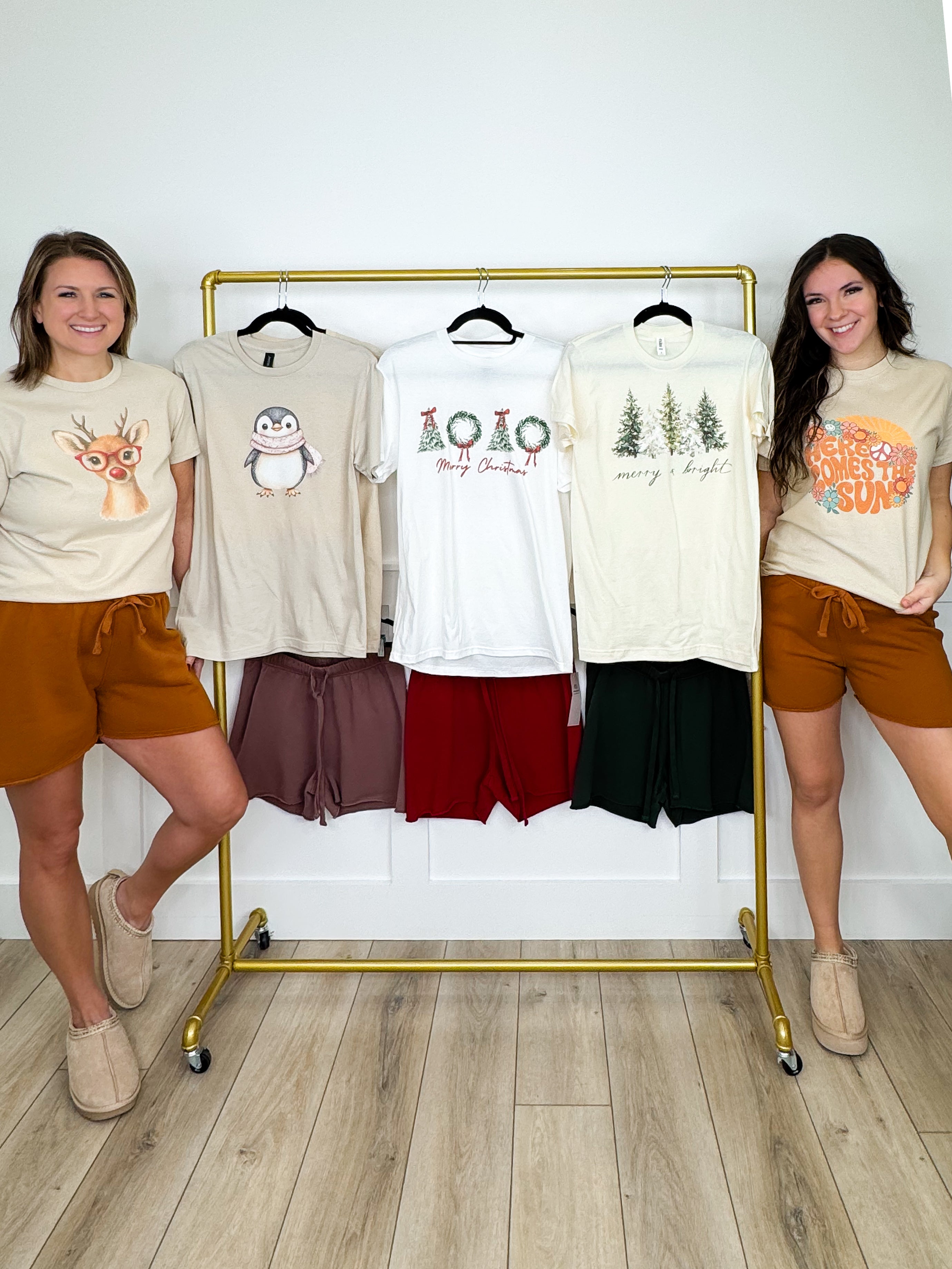 Sand Tee: Rudolph or Here Comes the Sun - Camel Shorts | Penguin or Smile - Mauve Shorts | Snowglobe or Homebody - Brown Shorts
