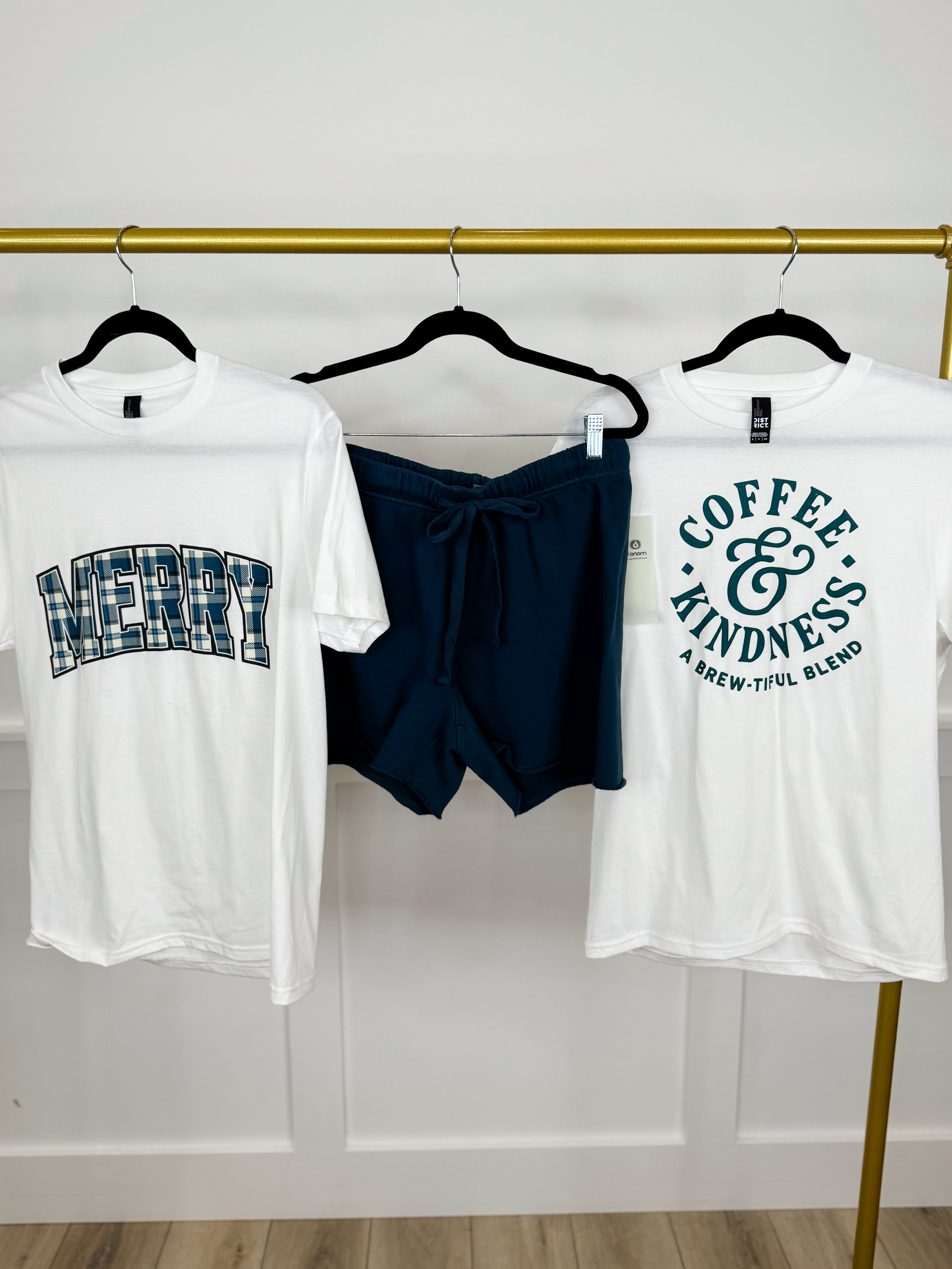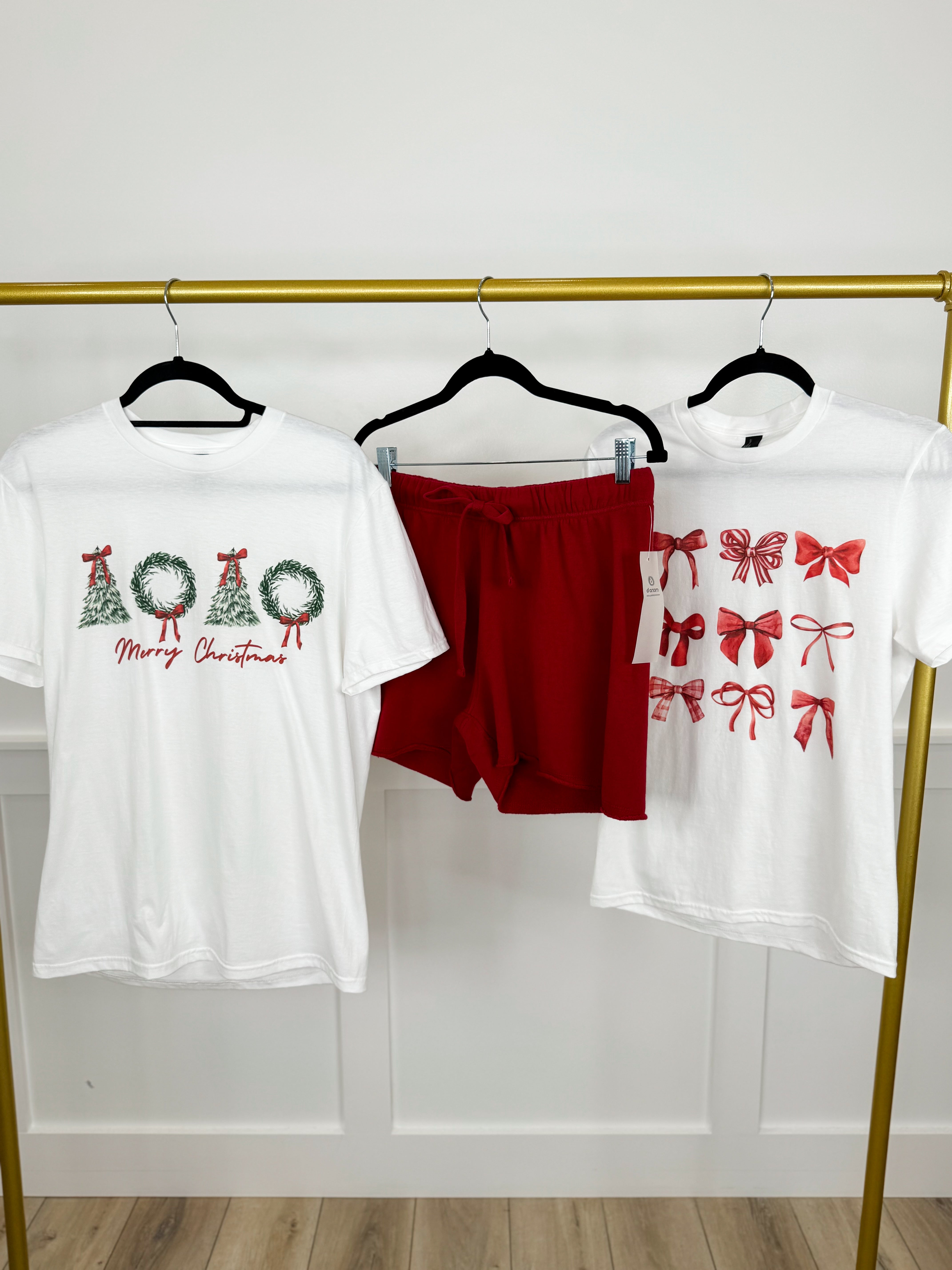 White Tee: Merry Christmas or Bows - Red Shorts | Merry Plaid or Coffee - Teal Blue Shorts | Holly Jolly or Peace - Magenta Shorts