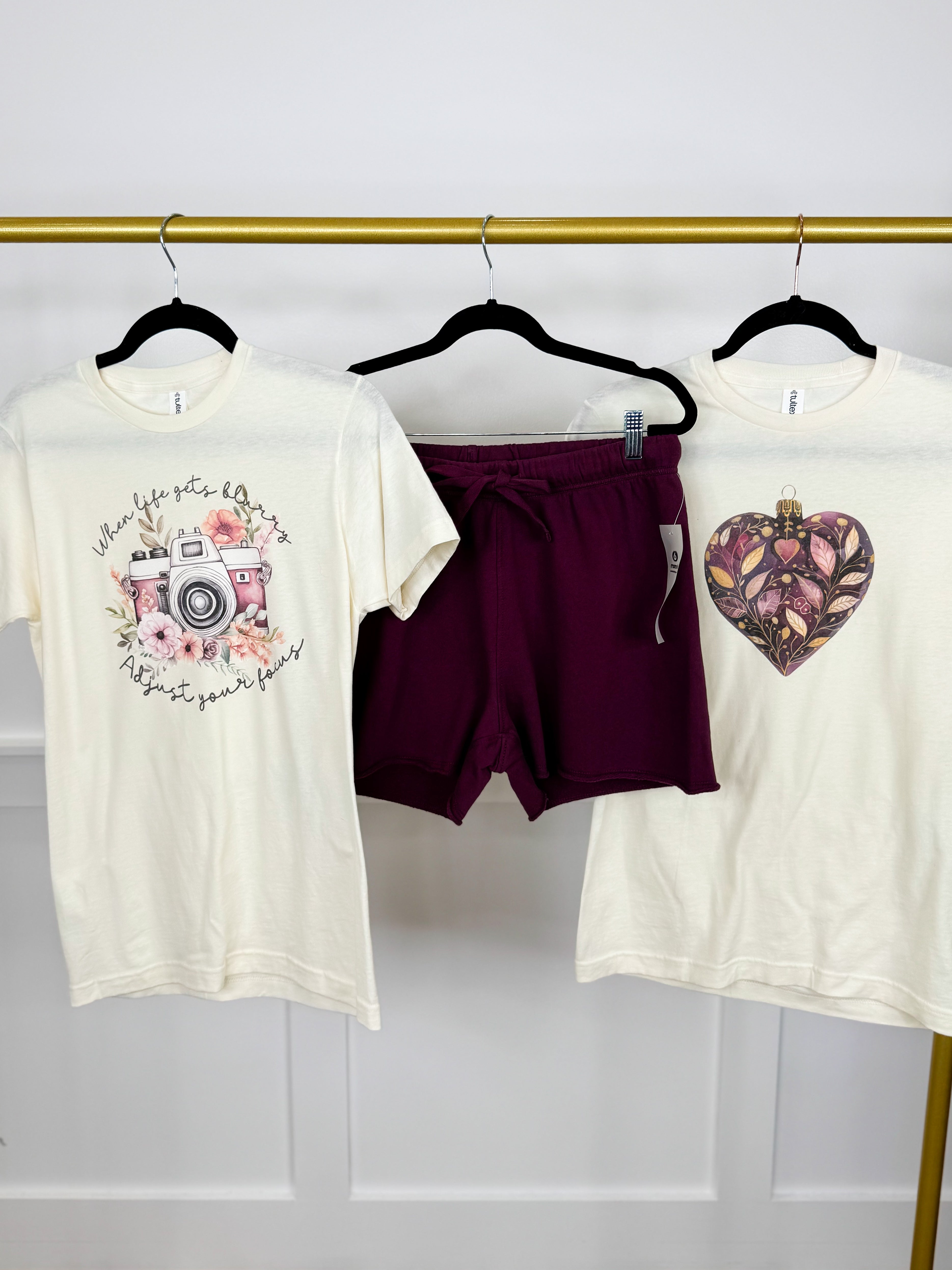 Cream Tee: Merry & Bright or Butterfly - Forest Green Shorts | Ornament or Camera - Plum Purple Shorts