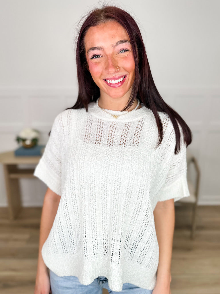 Effortlessly chic and undeniably cozy, this cream knit top brings laid-back elegance to your everyday rotation. The open knit construction creates an airy, breathable feel perfect for layering or wearing solo, while the oversized silhouette drapes beautifully for a relaxed, modern vibe. Short sleeves keep things breezy without sacrificing warmth. Whether you're dressing it up with tailored trousers or keeping it casual with your favorite jeans, this sweater top is your new go-to for looking put-together without trying too hard.