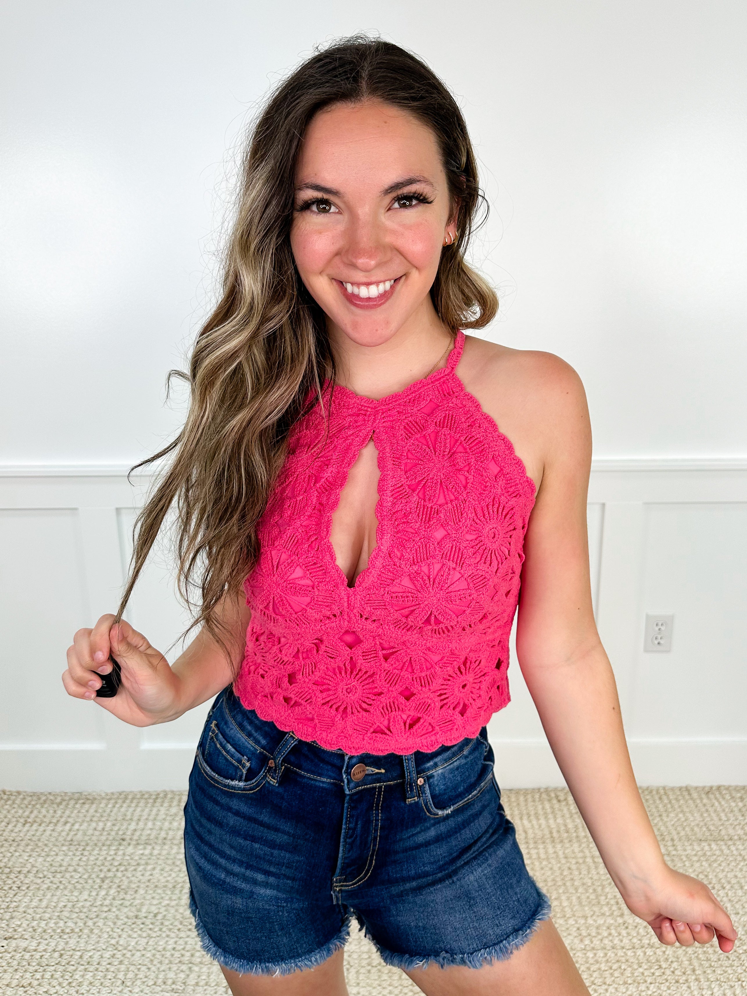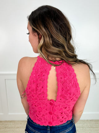 Stay cool and stylish with our Throwing Peace Signs Knit Avery Mae Tank Top! This halter-style top features functioning buttons down the back and a crochet knit design in 3 fun colors. Perfect for any occasion, you'll be the envy of all your friends!