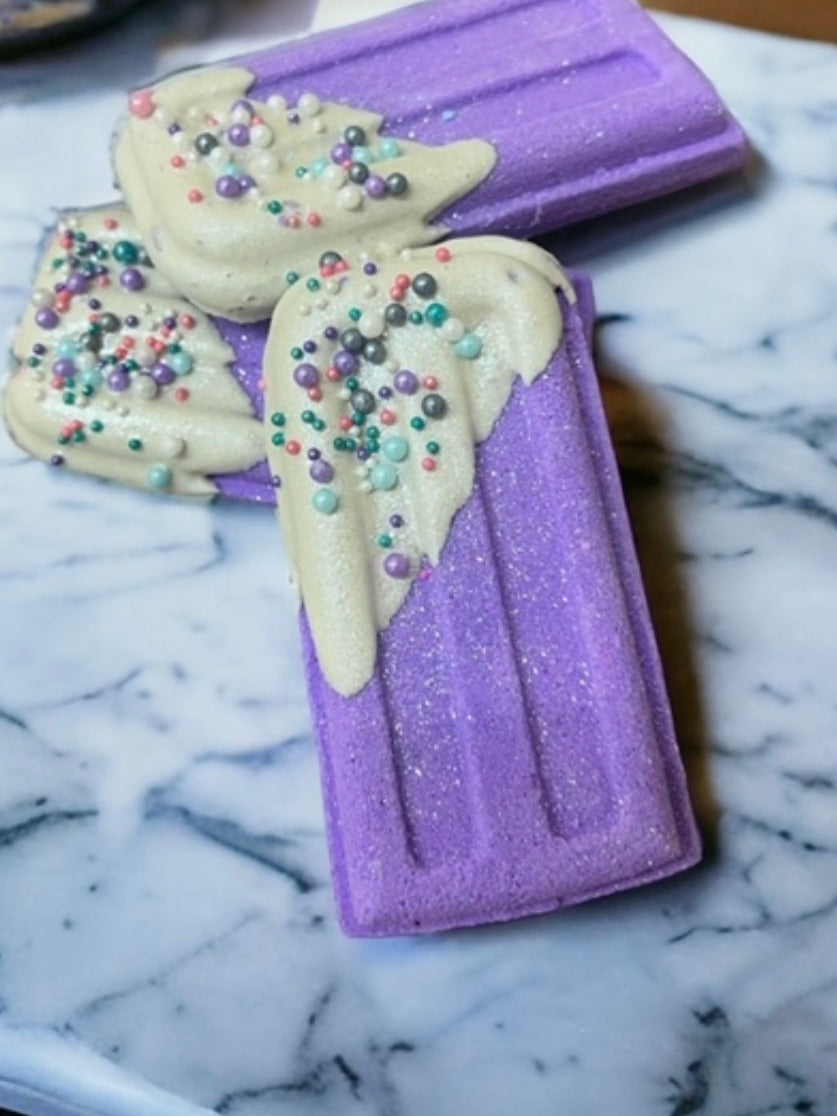 Dive into fun with our Sprinkle Sparkle Popsicle Bath Bombs! Available in three vibrant colors, each bath bomb fizzes with a sweet grape candy scent and is hand-drizzled with nourishing cocoa butter. Infused with goat milk and coconut oil, they soften and moisturize your skin while turning your bath into a colorful, playful escape. Plus, discover a surprise prize inside—perfect for gifting or treating yourself to a bubbly, joyful soak.