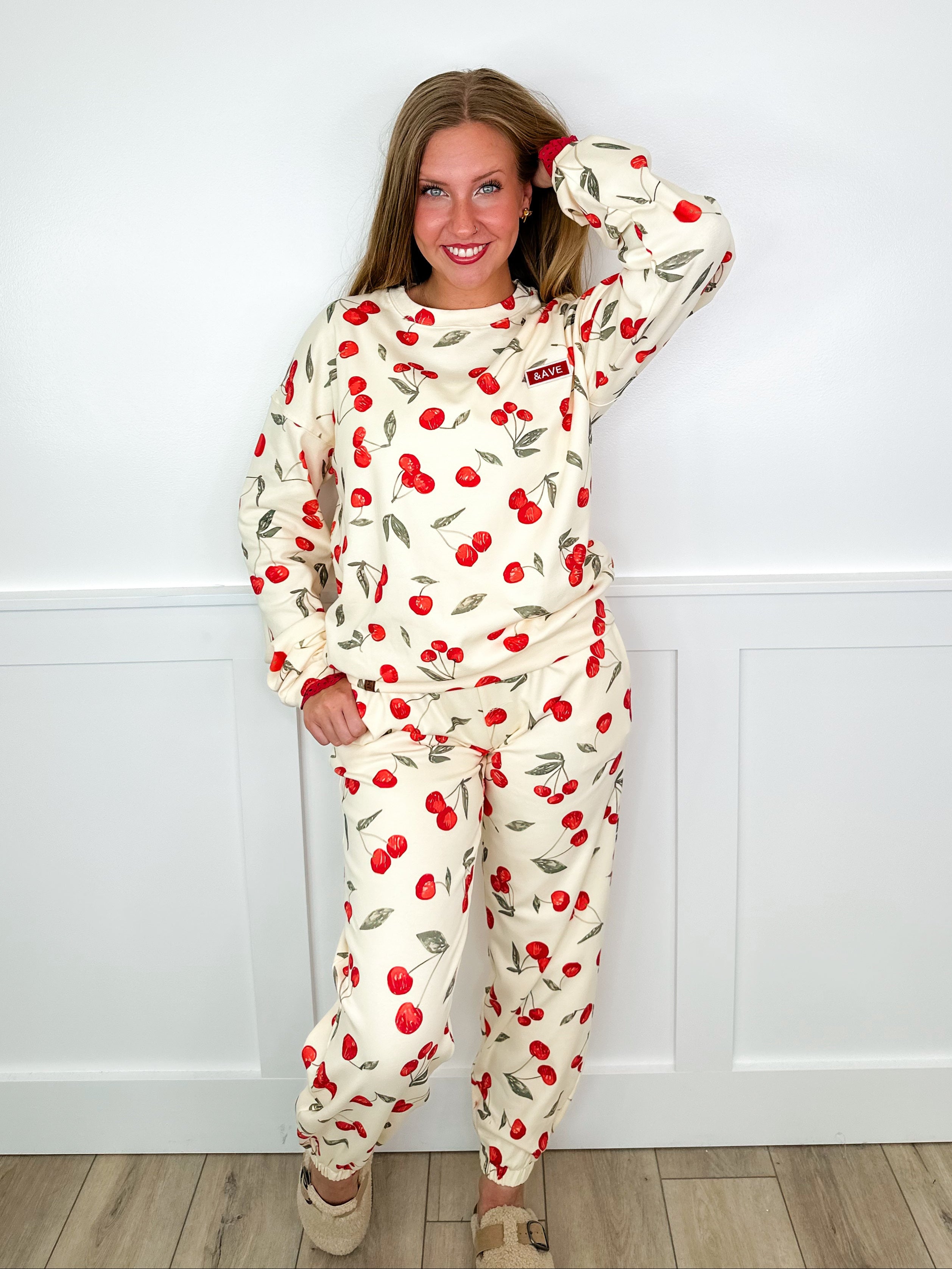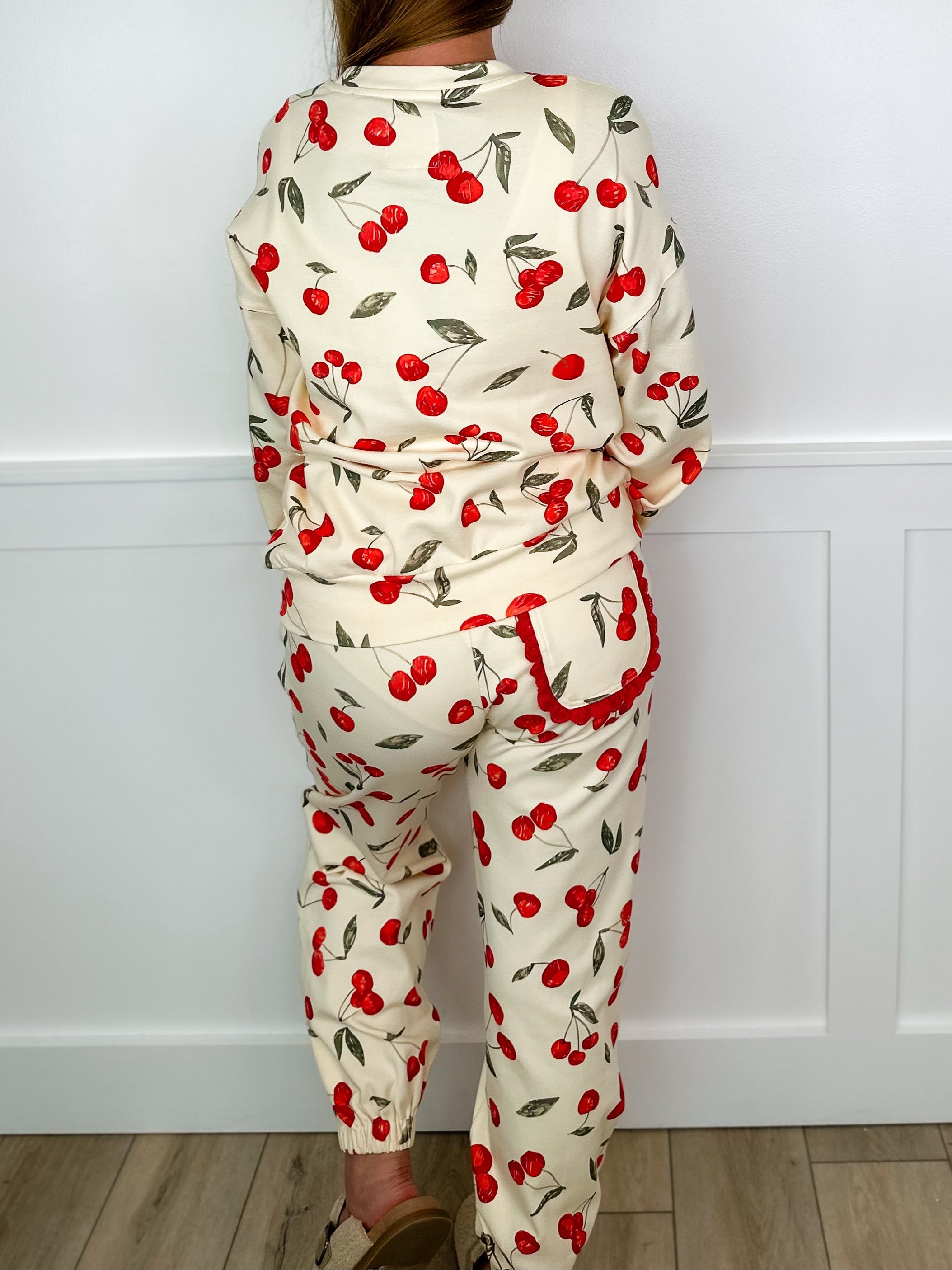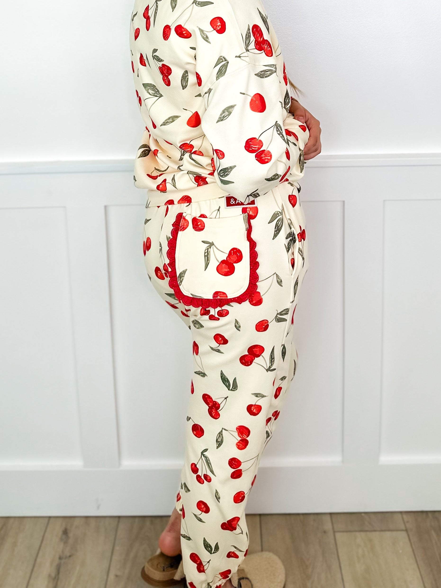 These cream joggers bring a playful touch with sweet cherry prints on a soft base. Designed for comfort, they feature an elastic waistband for a perfect fit and a charming back pocket trimmed with scalloped red lace, adding a flirty detail to your casual look. Perfect for lounging or casual outings with a fun twist.