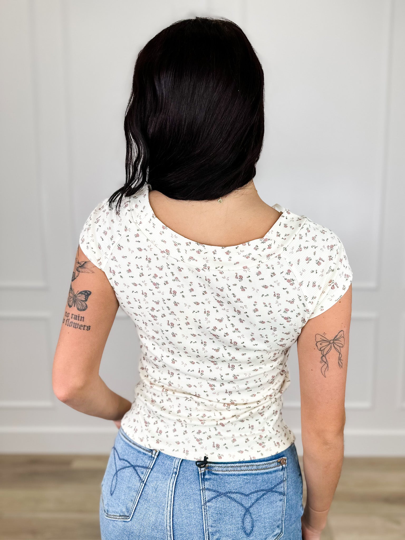 Effortlessly charming, this cream rayon blend top features delicate bows and floral details scattered across the fabric. The relaxed short sleeves offer comfortable everyday wear, while the soft, breathable material keeps you cool and comfortable. Perfect for pairing with jeans, skirts, or trousers for a polished yet playful look that transitions seamlessly from day to evening.