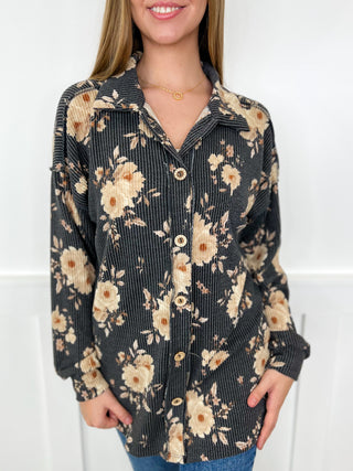 Moody Meadows Ribbed Long Sleeve Charcoal Avery Mae Button Up Top