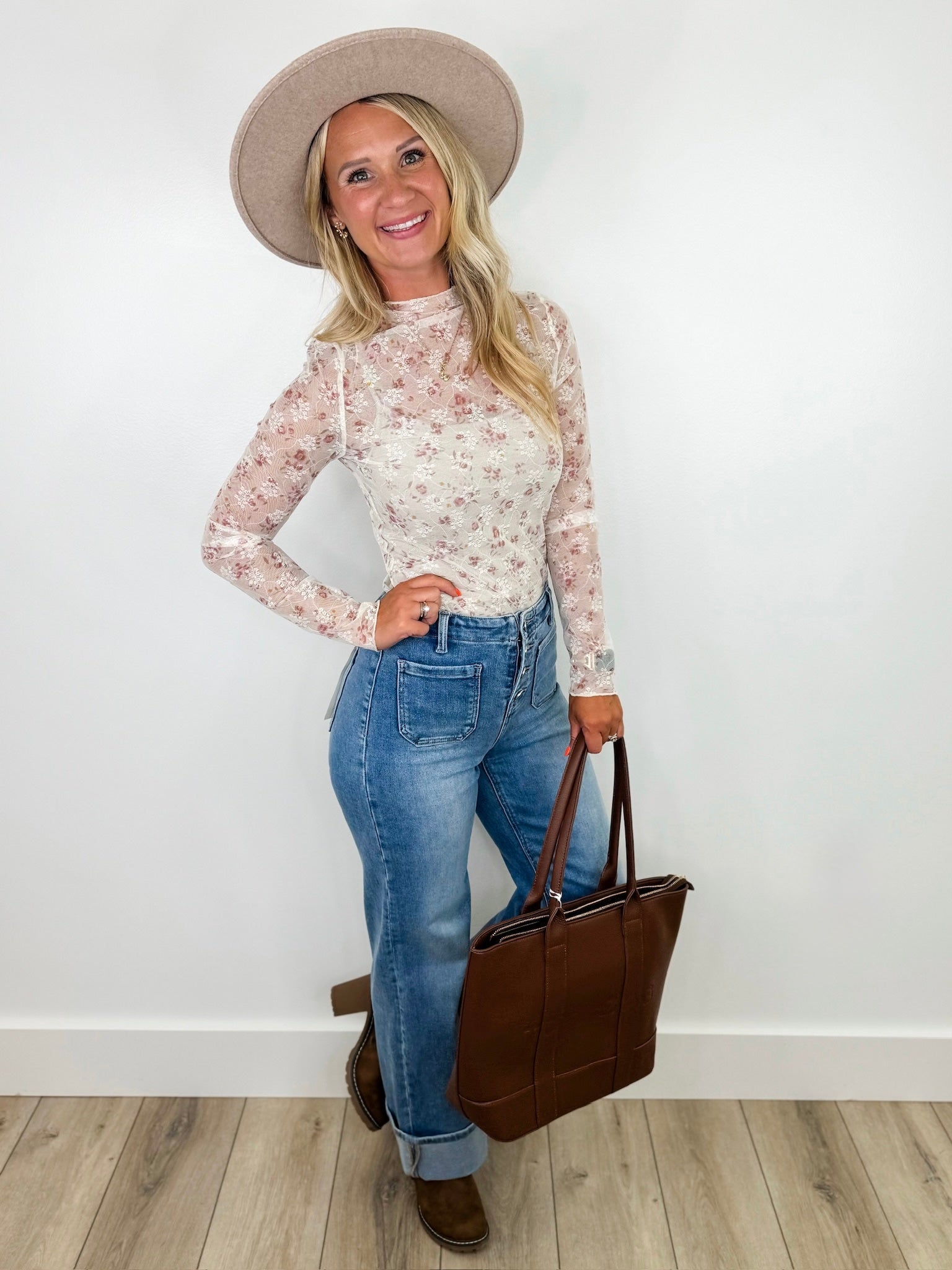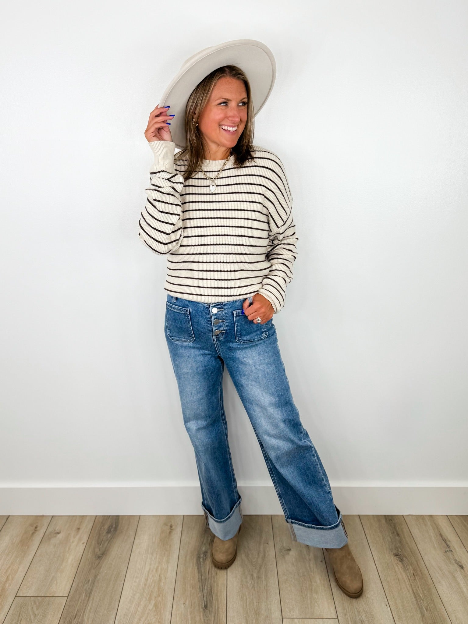 Step out in style with these Risen Nova High Rise jeans, featuring a playful wide-leg cut and cuffed hems for a breezy, laid-back vibe. The patch-shaped front pocket adds a quirky touch, making these medium wash blue jeans a fun and fashionable choice for any casual day.