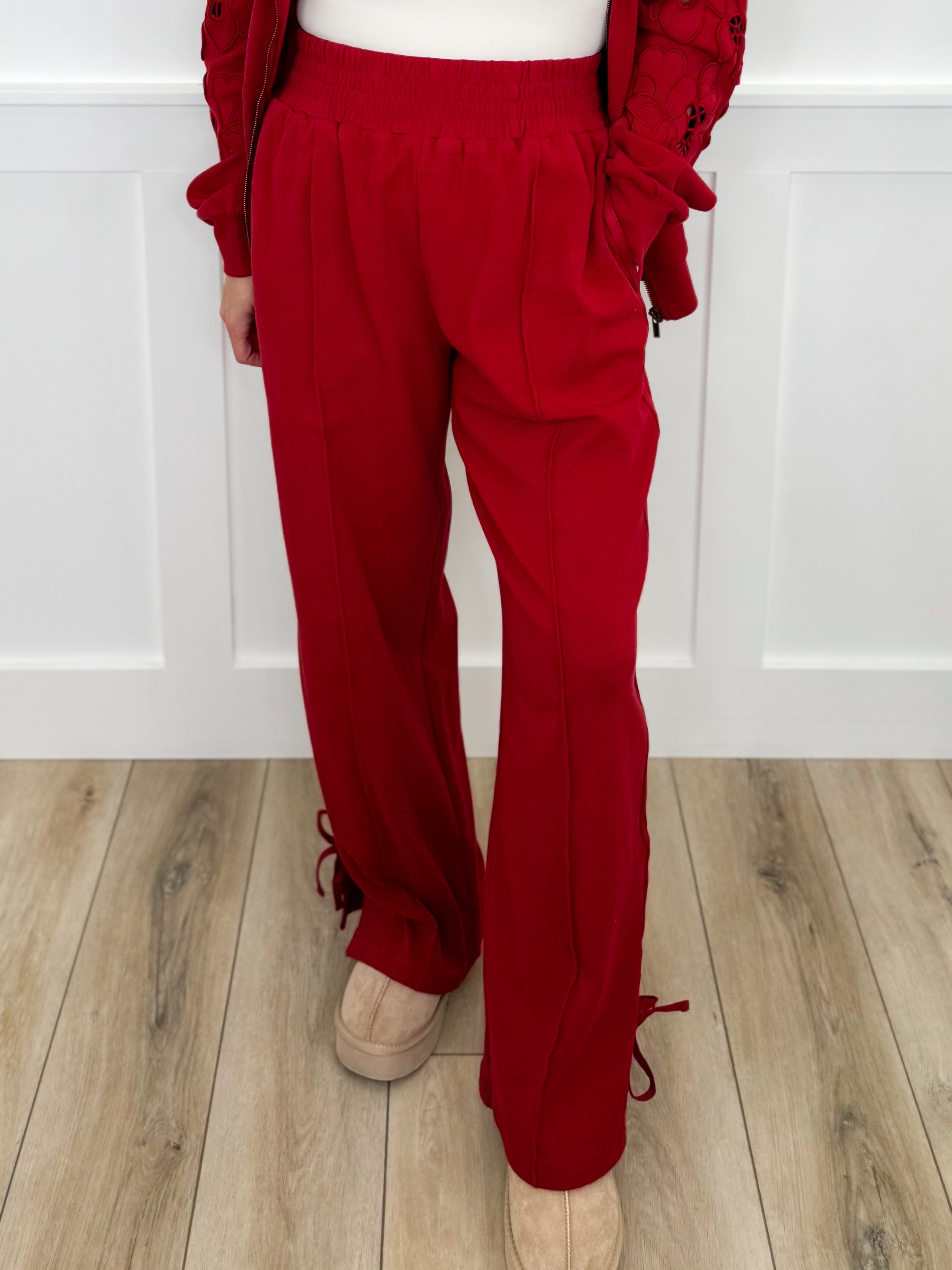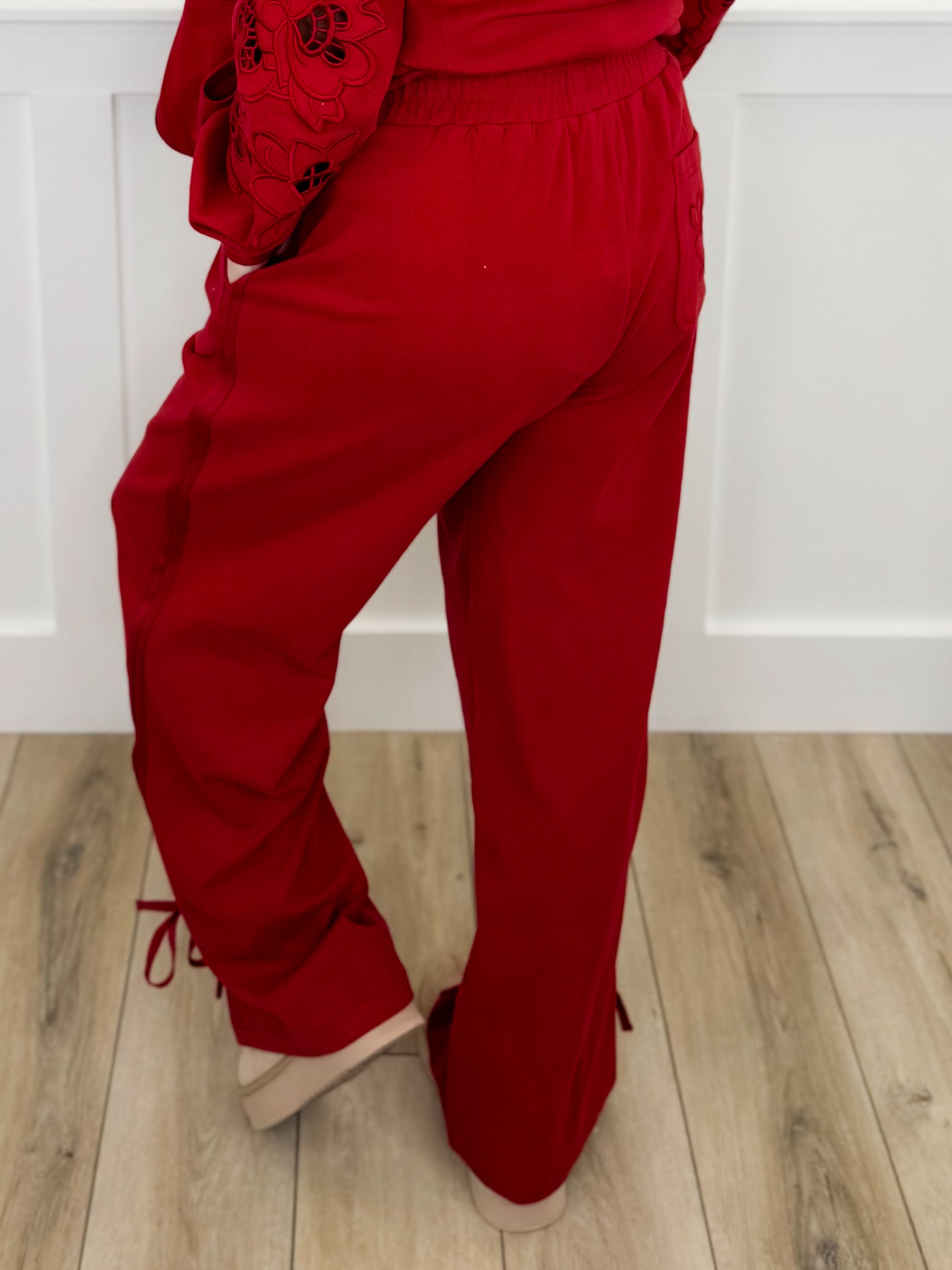 Strut your stuff in these show-stopping wide leg bottoms that mean business—and fun. Featuring a flattering high rise cut, soft cotton blend fabric, and those signature details that make heads turn: crisp front piping for a polished edge, a cheeky side bow at the hem, and an embroidered back pocket that's basically wearable art. Perfect for anyone who refuses to blend in.