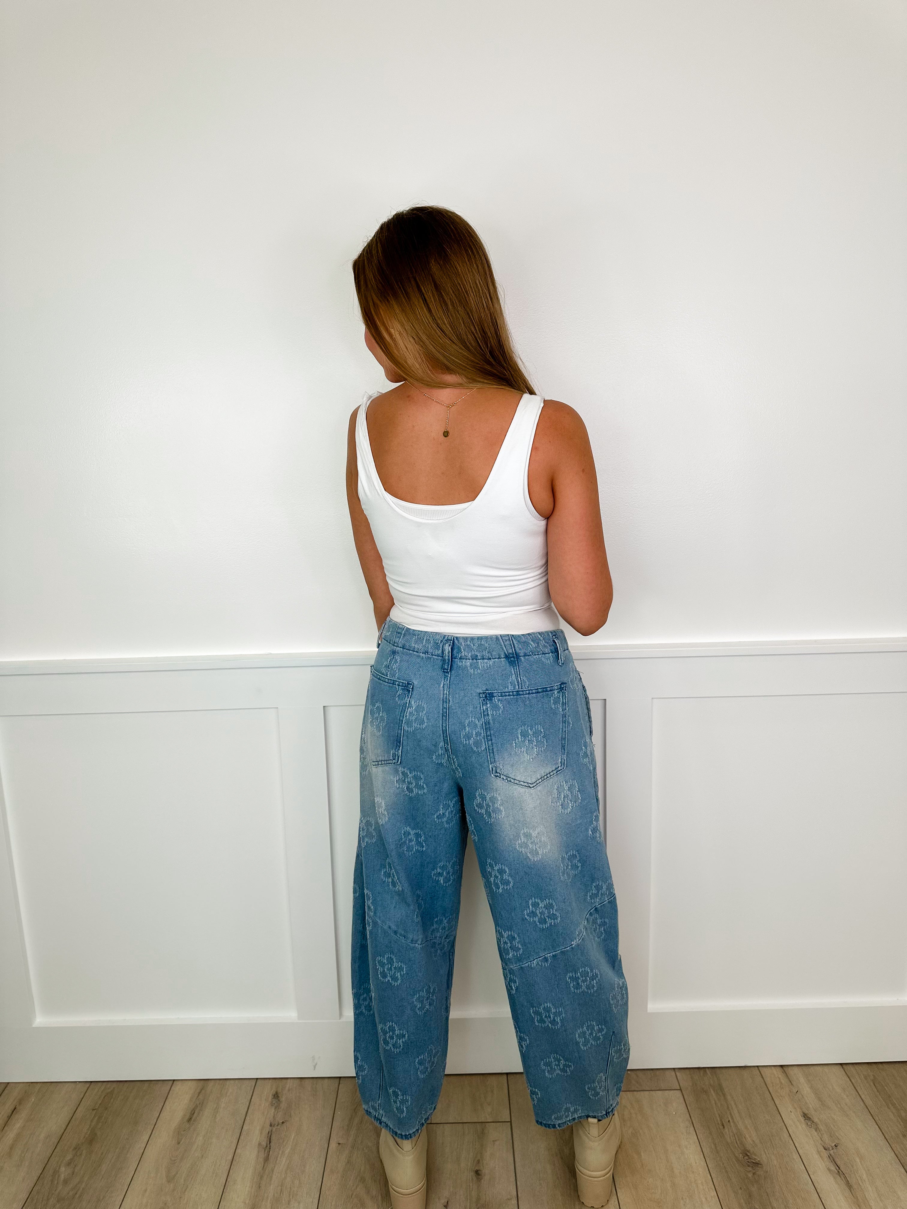 Add a playful twist to your wardrobe with the Easel Pushing Petals High Rise Cotton Barrel Leg Bottoms. Crafted from washed denim, these bottoms feature a delicate, faint flower pattern that brings subtle charm to your look. The high-rise fit and barrel leg silhouette combine comfort with style, making them perfect for casual days or weekend adventures. Available in two fun colors to brighten up any outfit!