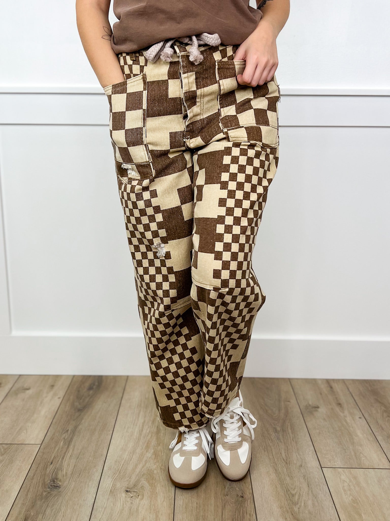 Step out in style with the Let's Rally High Rise Cotton Wide Leg Checkered Avery Mae Bottoms. Featuring a tan and mocha checkered print, these pants bring a playful twist to your wardrobe. The braided rope belt adds a charming touch, while the button fly offers classic detail. Comfortable and trendy, they’re perfect for rallying your look with a breezy, confident vibe.