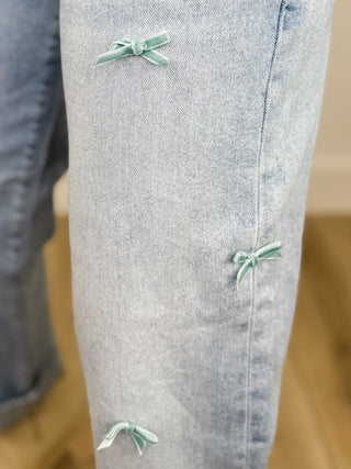 Risen Cassidy High Rise Barrel Leg Bow Detail Light Wash Cropped Blue Jeans