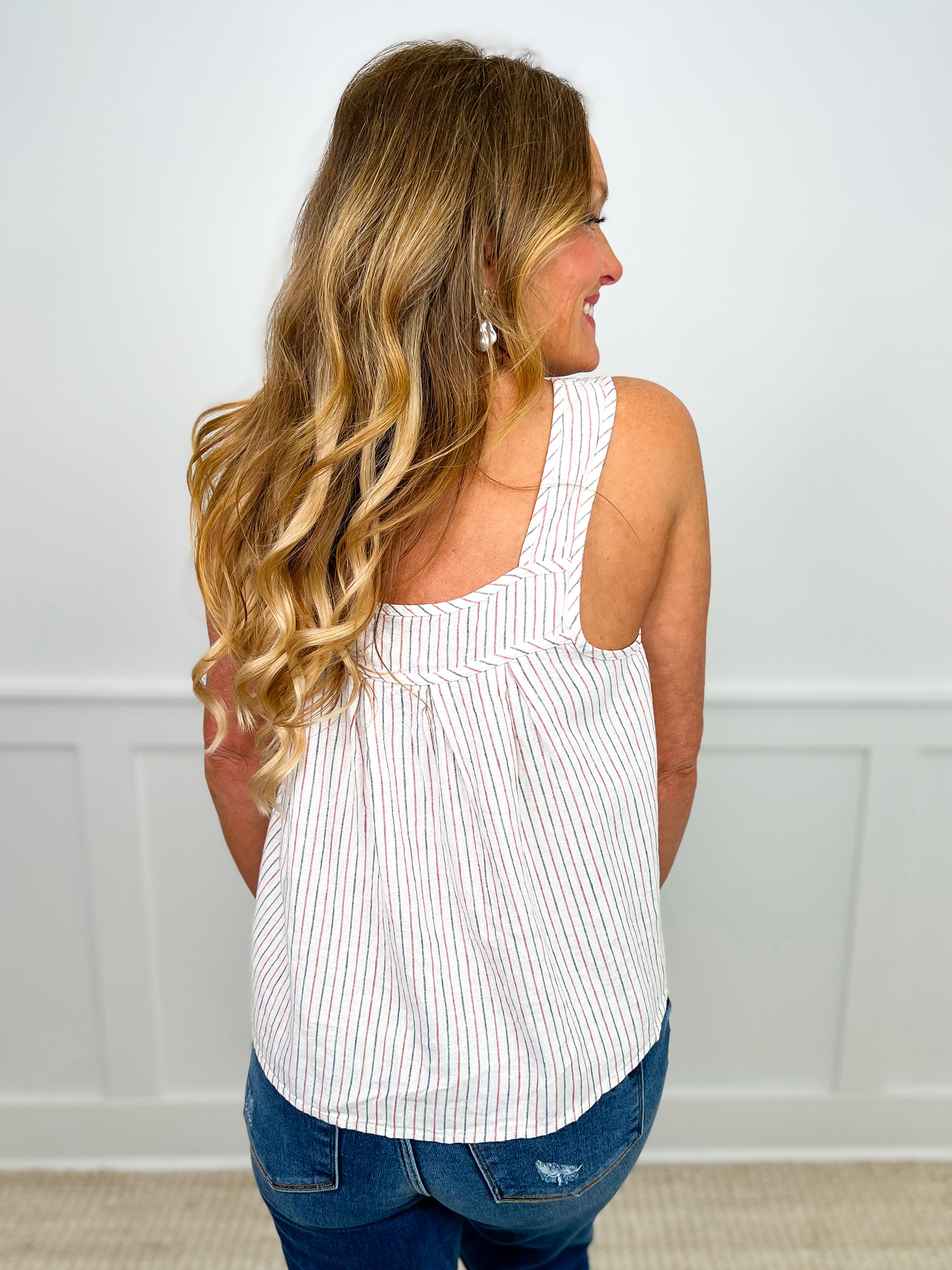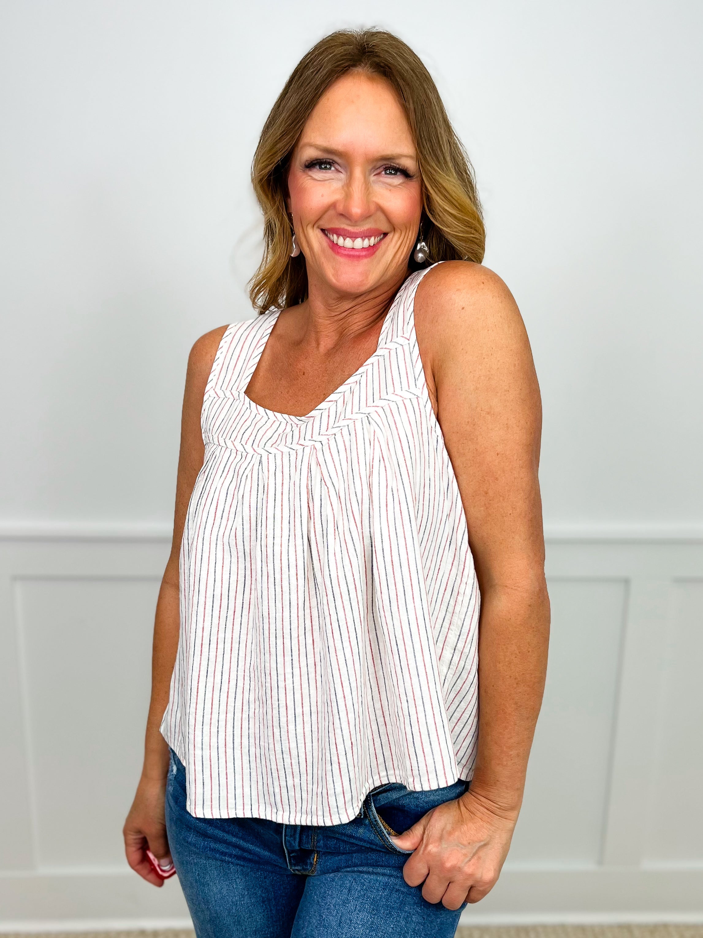 Celebrate your style with our Festive Freedom White Avery Mae Tank Top featuring eye-catching red and blue stripes. This patriotic piece isn't just fashionable—it's versatile enough for backyard barbecues, fireworks displays, or casual summer outings. The comfortable fit and quality fabric ensure you'll look and feel amazing all day long. Make a statement that's both stylish and spirited.