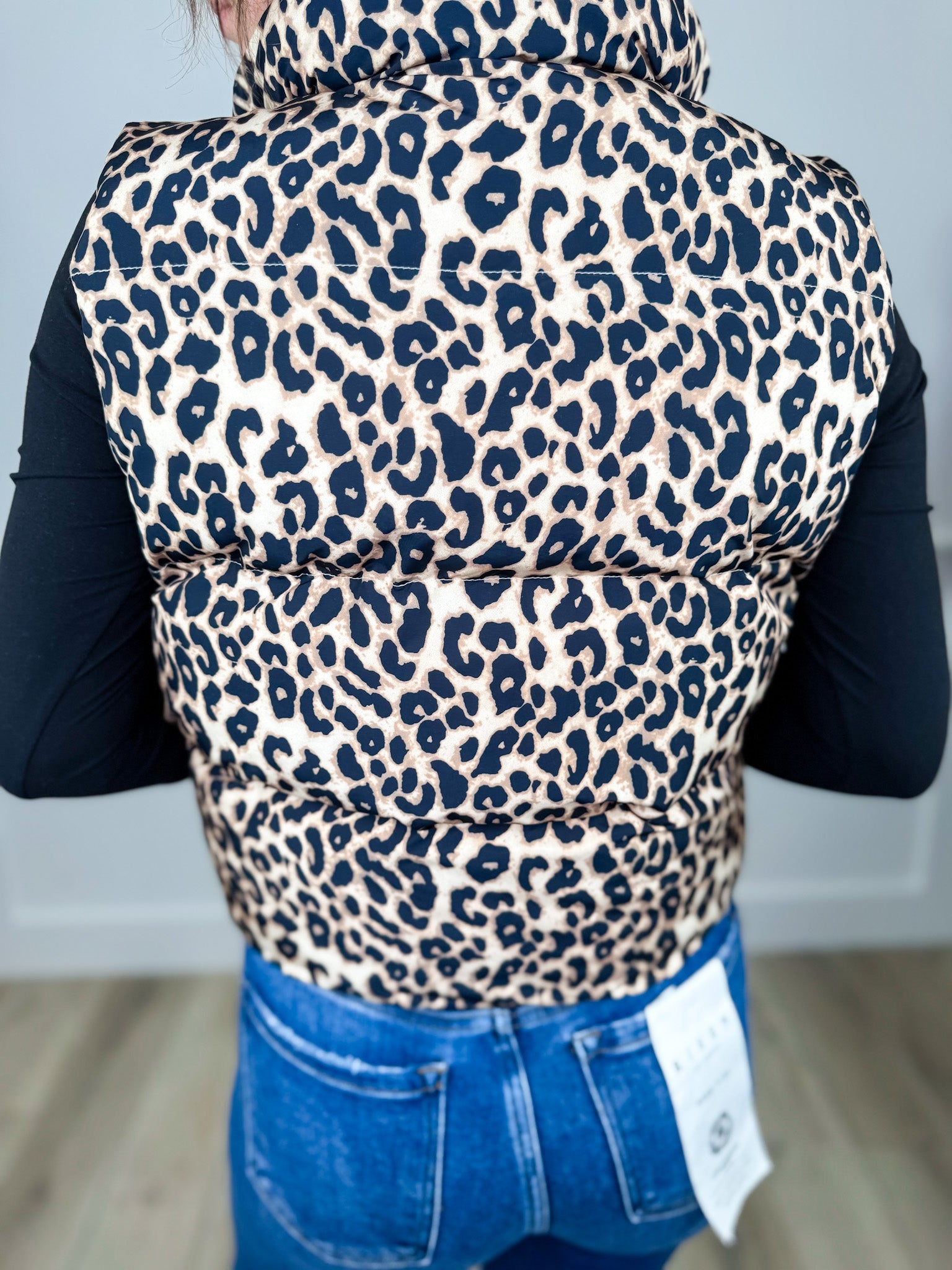 Stay cozy and chic with this leopard print puffer vest featuring a cropped silhouette that's perfect for layering. The full zip design makes it easy to slip on and off, while functional pockets keep your essentials within reach. Whether you're running errands or catching up with friends, this statement piece adds instant style to any outfit. Spot-on comfort meets bold fashion in one versatile vest.