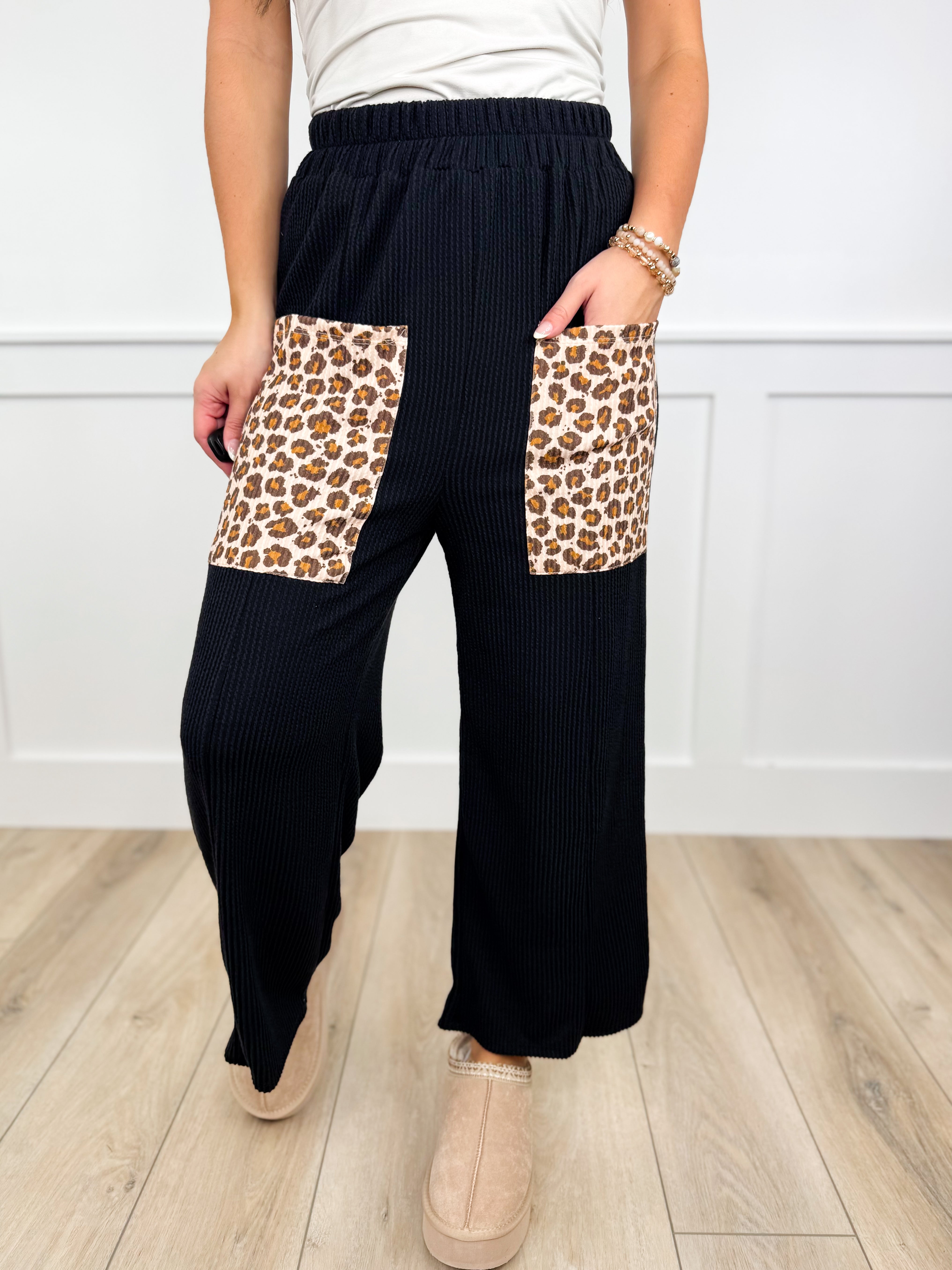 Step out in style with these high-rise ribbed wide-leg bottoms, designed for comfort and flair. Featuring an elastic waistband for a perfect fit and playful leopard print pockets that add a fun twist to your look. Available in three vibrant colors, these Avery Mae bottoms are your new go-to for effortless chic and cozy days.