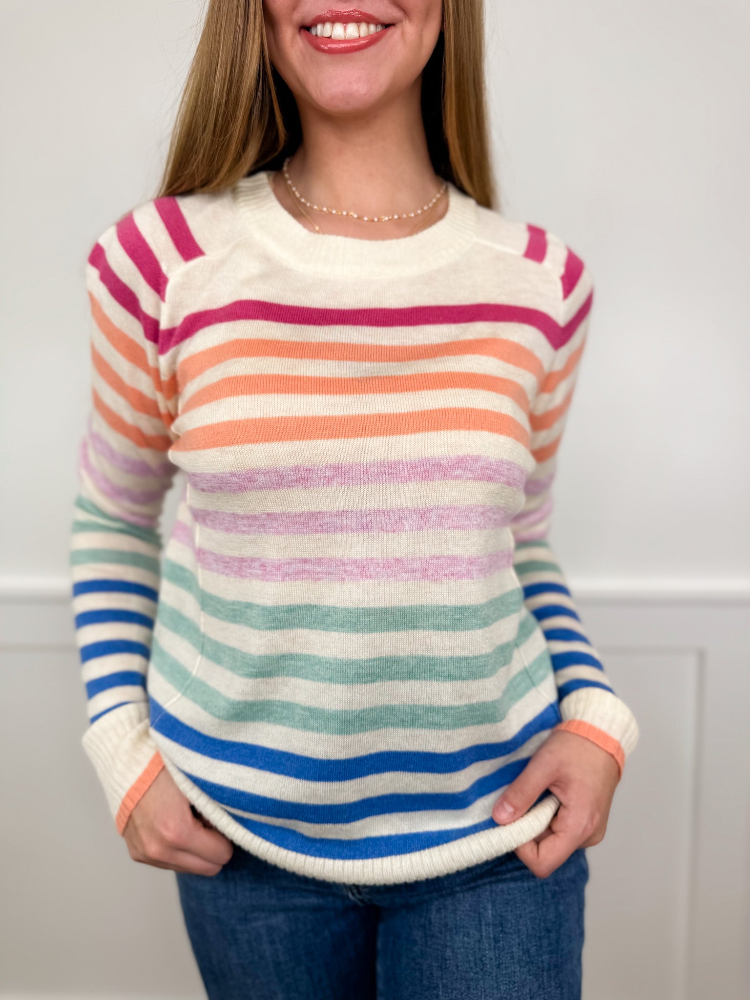 Add a pop of fun to your wardrobe with the Brighten My Day Knit Long Sleeve Cream Avery Mae Top. Featuring bright-colored horizontal stripes, this cozy knit shirt brings cheerful energy to any outfit. Its soft fabric and playful pattern make it perfect for brightening up cooler days while staying comfy and stylish.