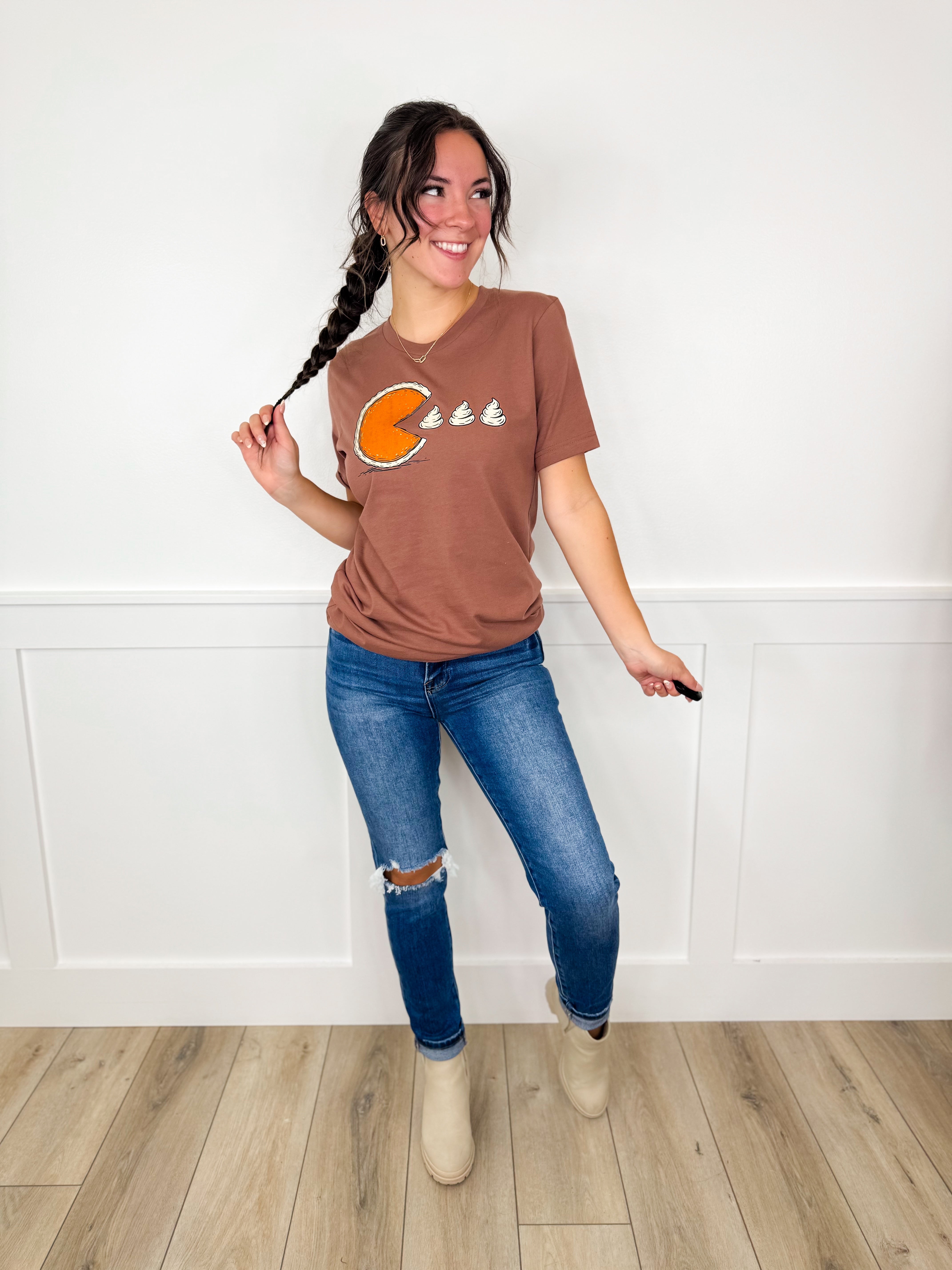 Celebrate your favorite fall treat and childhood game with the Dessert Dash Cotton Tee. This playful shirt features a clay-colored Pac-Man pumpkin pie graphic, complete with whipped cream dots, bringing a fun twist to autumn style. Crafted for comfort and casual cool, it’s perfect for cozy days and dessert cravings alike.