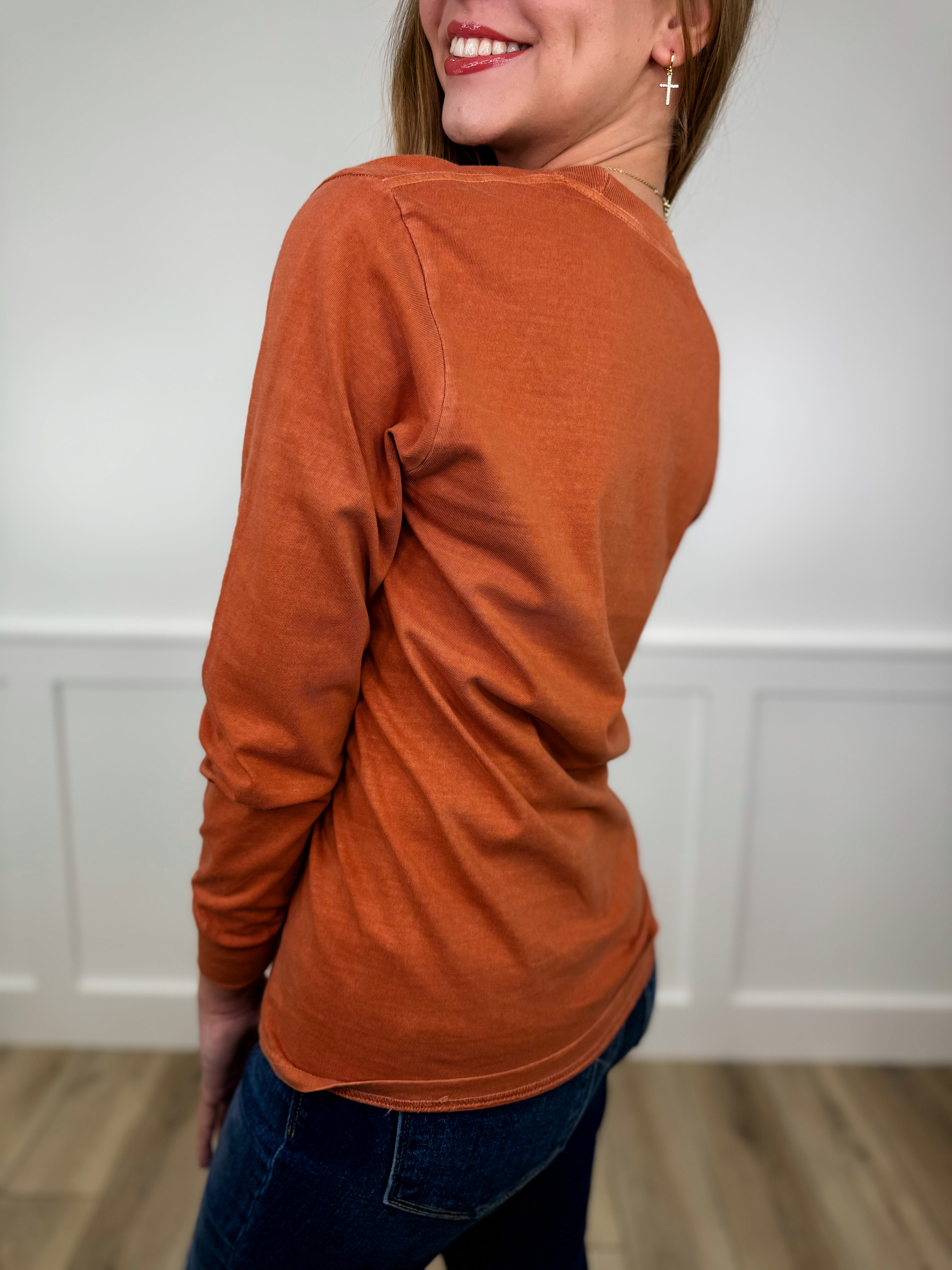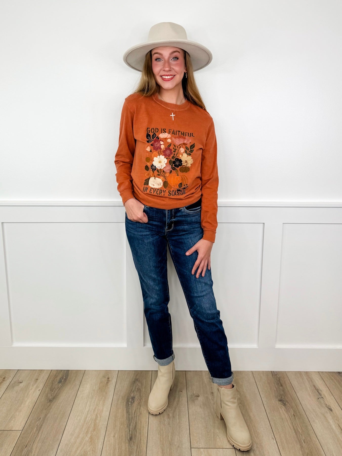 Celebrate the cozy vibes of fall with this playful vintage wash long sleeve tee. Featuring charming pumpkins, delicate florals, and the reassuring message "God is faithful in every season," this soft orange shirt adds warmth and spirit to your autumn wardrobe. Perfect for crisp days, it blends comfort with a heartfelt reminder that every season brings its own blessings.