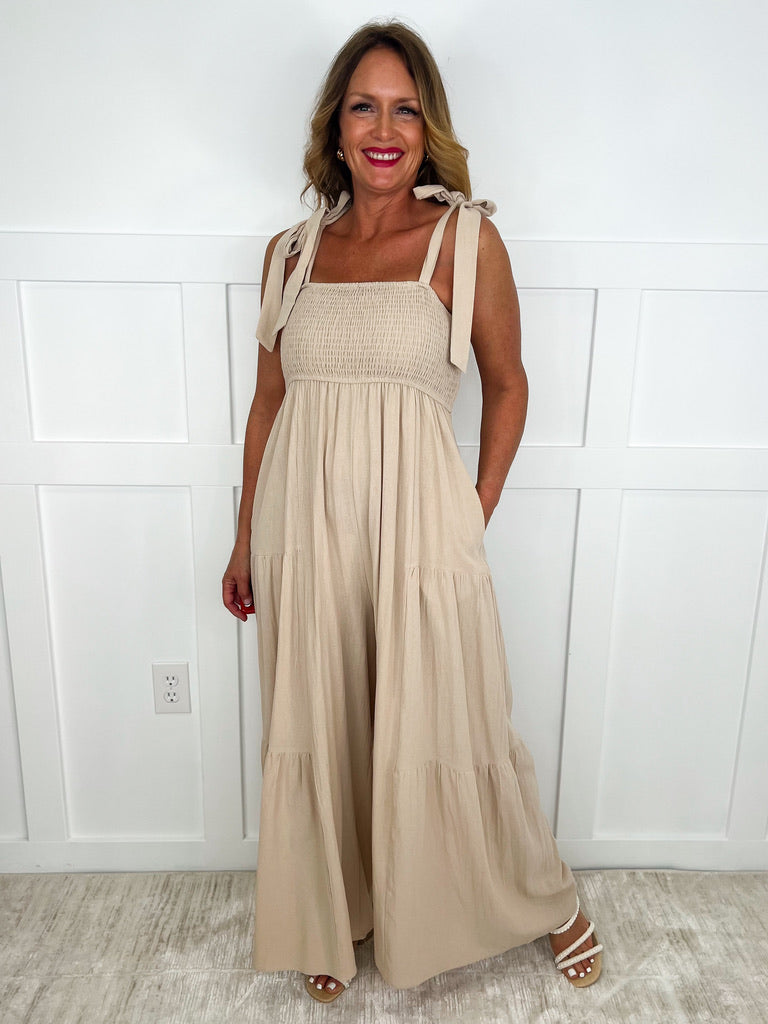 Embrace sunny days in our cotton blend tan jumpsuit! Featuring charming smocking detail, convenient pockets, and a wide leg silhouette that's delightfully flowy. The adjustable tie straps add a playful touch to this summer essential. Perfect for beach days, brunches, or just soaking up those sunshine vibes!