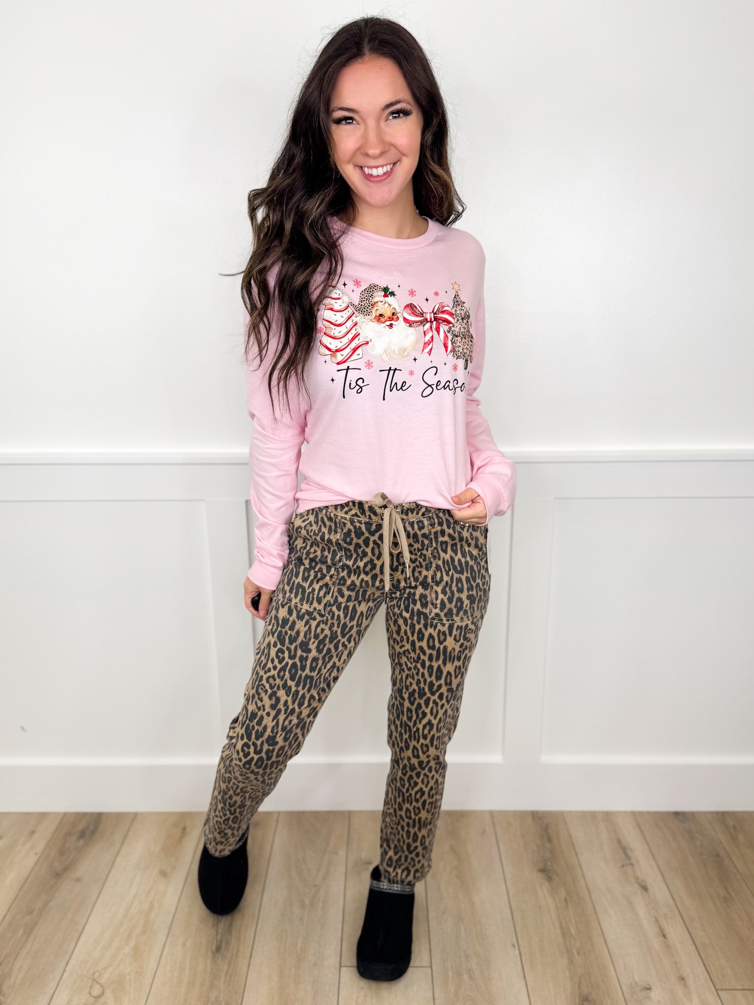 Celebrate the holiday spirit in style with this playful pink long sleeve tee from Avery Mae. Featuring a festive graphic of a Christmas tree cake accompanied by Santa, a candy cane bow and a chic leopard print twist, this tee adds fun and flair to your seasonal wardrobe. Made from soft cotton, it keeps you cozy while spreading cheer with a unique, trendy design. Perfect for holiday parties or cozy days at home!