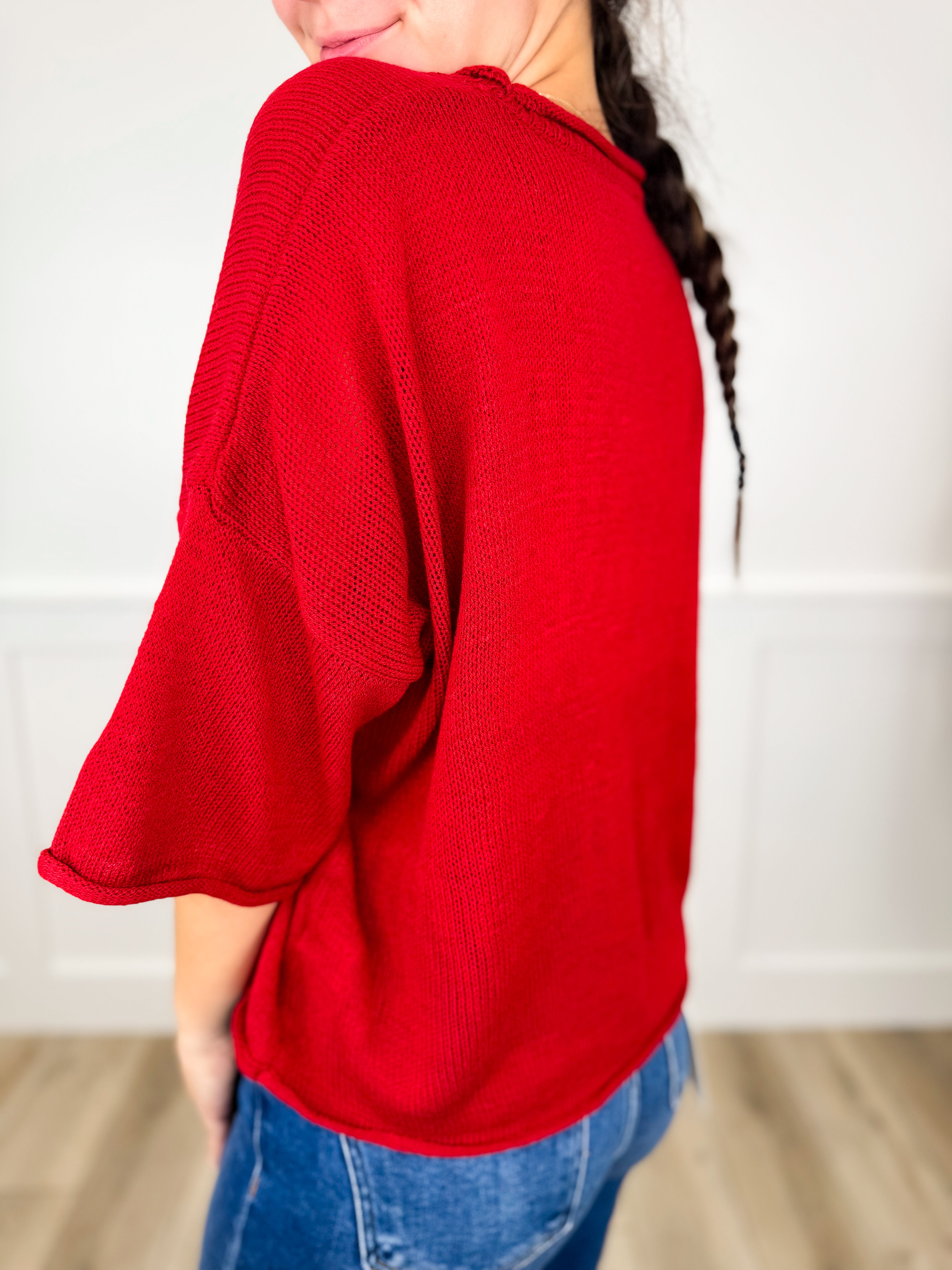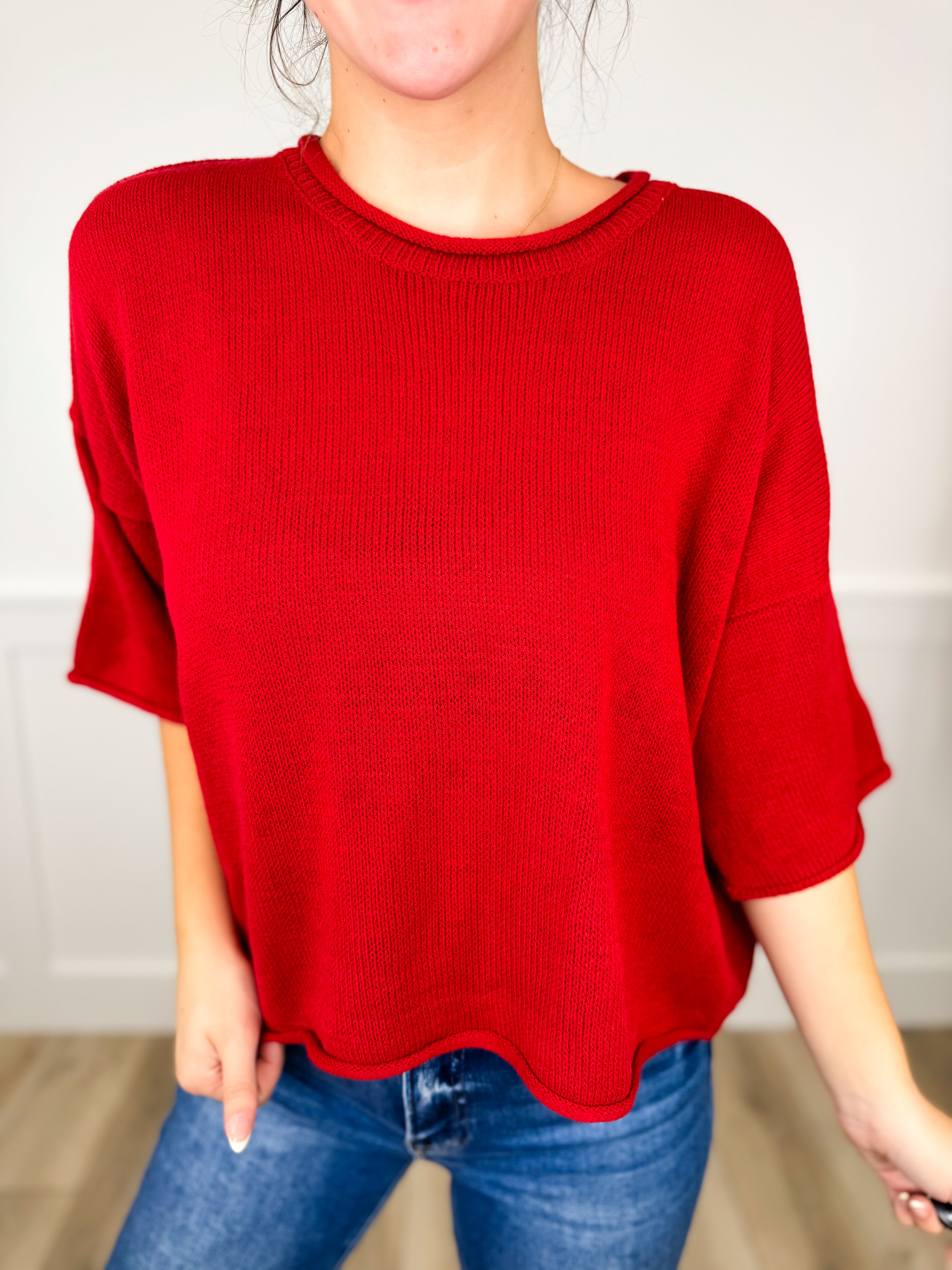 This vibrant red cropped top combines playful simplicity with stylish details. Crafted from solid knit fabric, it offers a comfy, breathable fit perfect for warm days. The charming roll-up sleeve detail adds a touch of laid-back flair, making it easy to pair with your favorite jeans or skirts for an effortlessly cool look. Brighten up your wardrobe with this fun and easygoing piece from Avery Mae!
