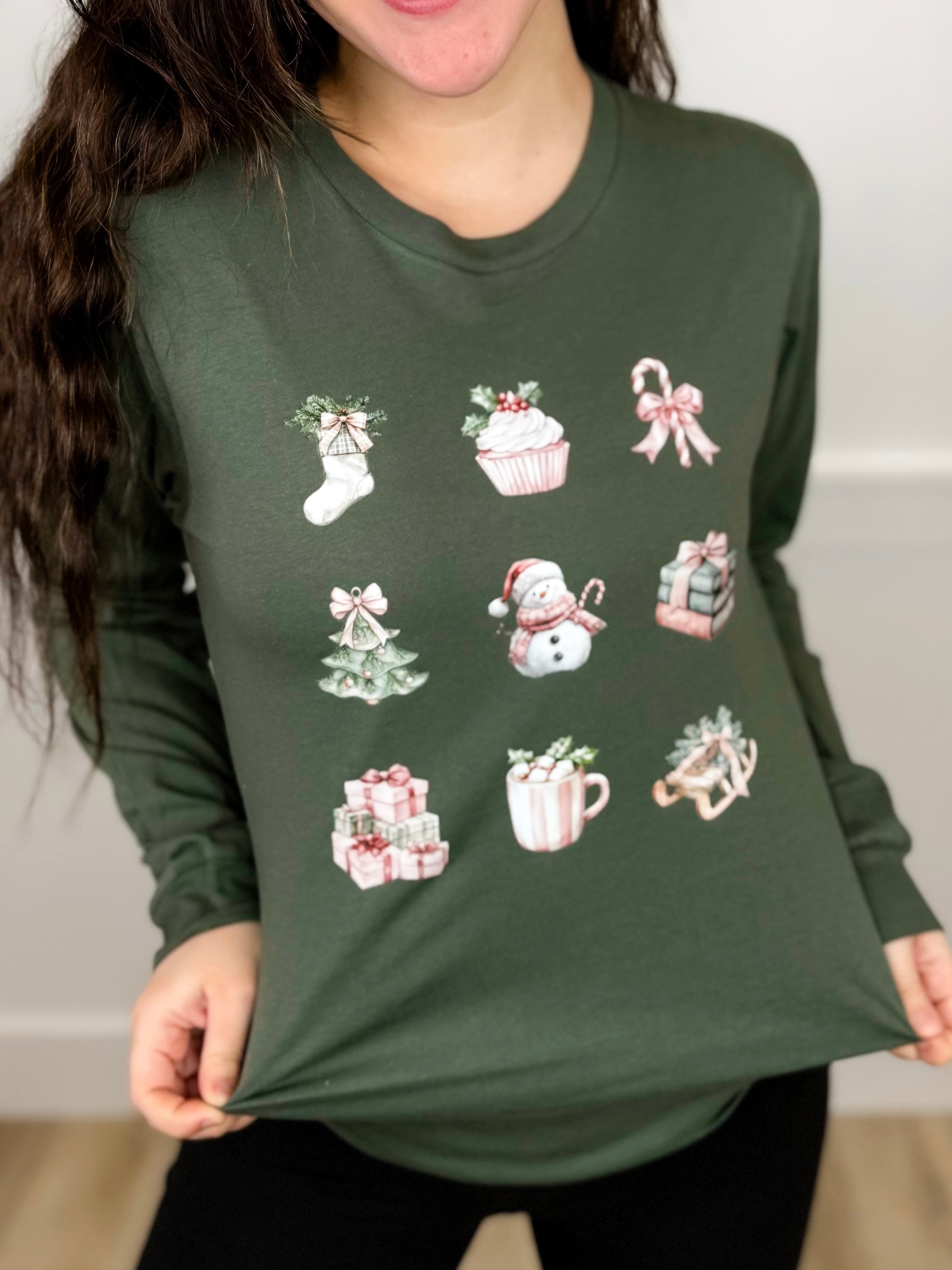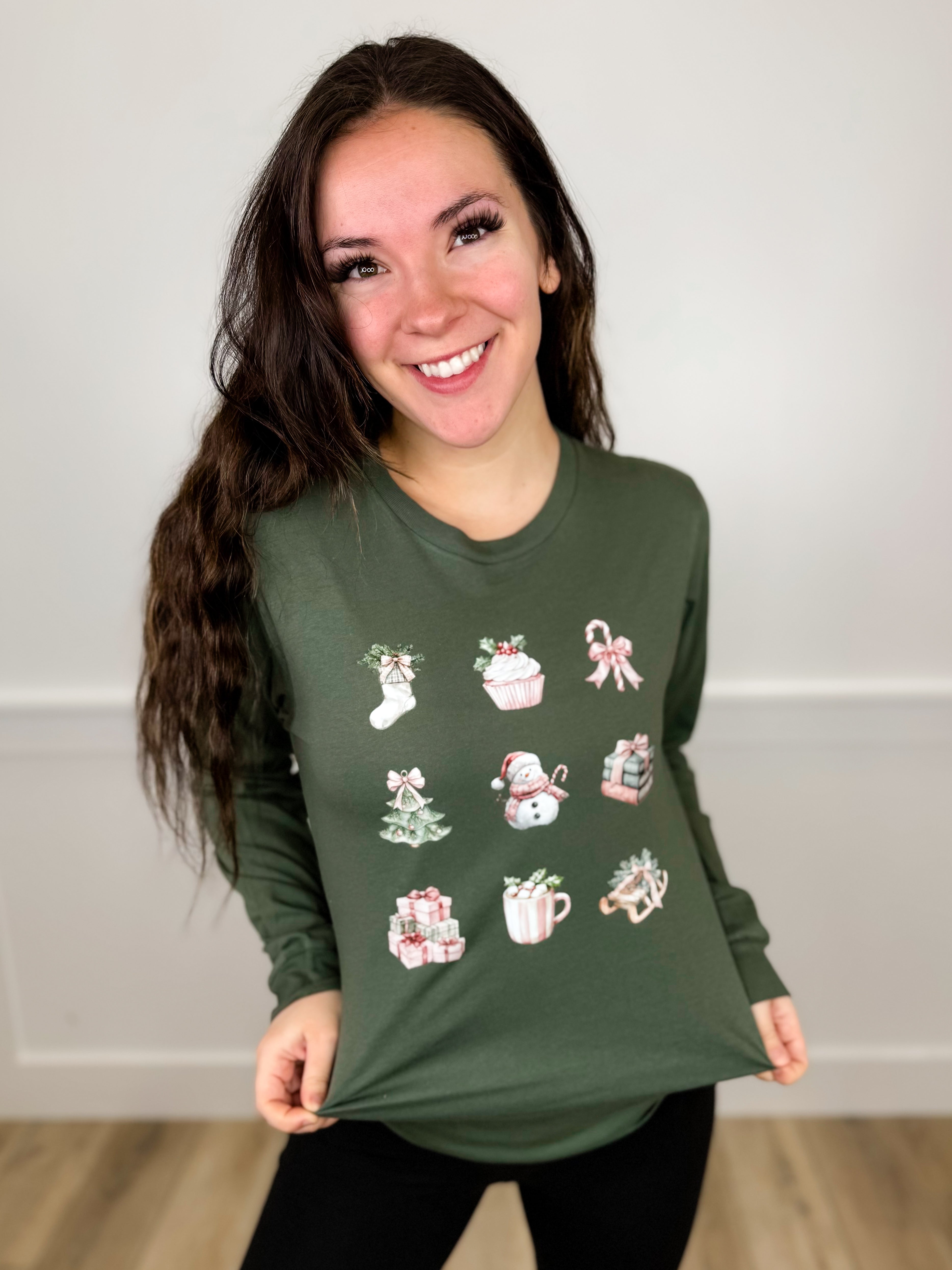 Spread holiday cheer in this vibrant green long sleeve tee featuring beloved festive icons that capture the magic of the season. Playful pink accents add a fun pop of color to this cozy cotton essential. Perfect for casual celebrations, family gatherings, or anyone who loves showing their festive spirit year-round. Comfortable, charming, and undeniably merry—your new seasonal favorite awaits!