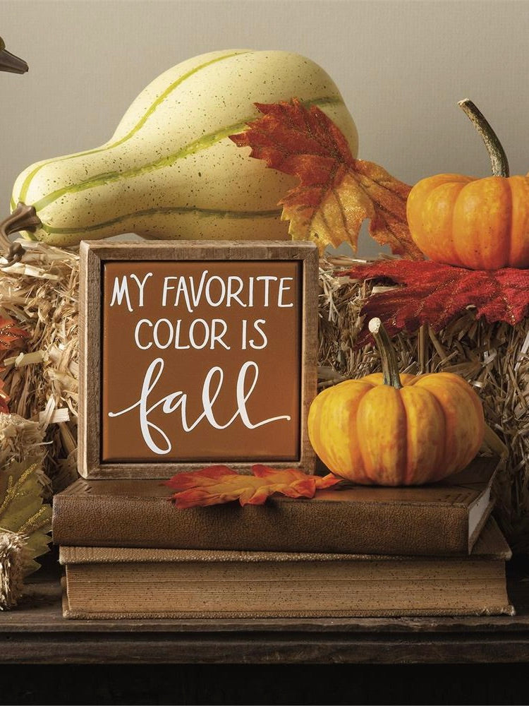 Celebrate the cozy vibes of autumn with this playful wooden block sign that declares "My favorite colors is fall." Perfect for adding a touch of seasonal charm to your shelf or mantel, this charming piece brings warmth and whimsy to any space. Its rustic design and fun message make it a delightful accent for fall lovers everywhere.