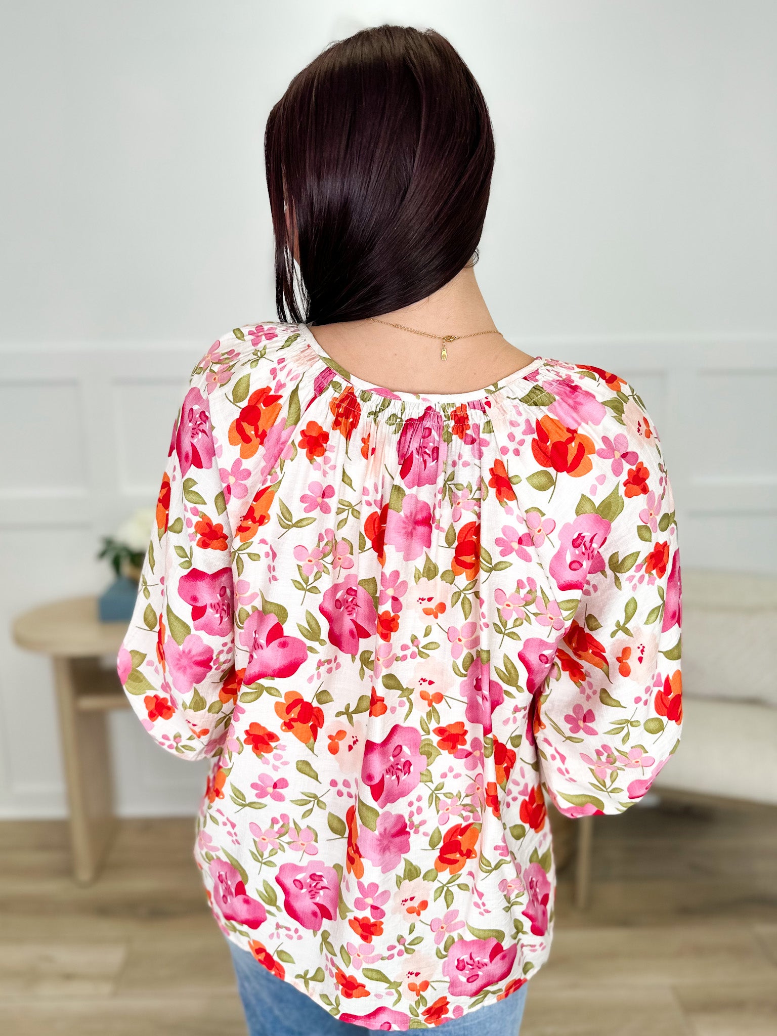 Slip into effortless style with this charming button-up top featuring a relaxed scoop neckline and soft cream base adorned with vibrant pink and orange florals. Crafted from a breathable rayon blend, it's the perfect piece for lazy afternoons or casual outings. The 3/4 sleeves keep things breezy while the cheerful floral print adds a pop of personality to any wardrobe. Whether you're dressing it up with tailored trousers or keeping it casual with your favorite jeans, this versatile top brings a touch of botanical beauty to your everyday look.