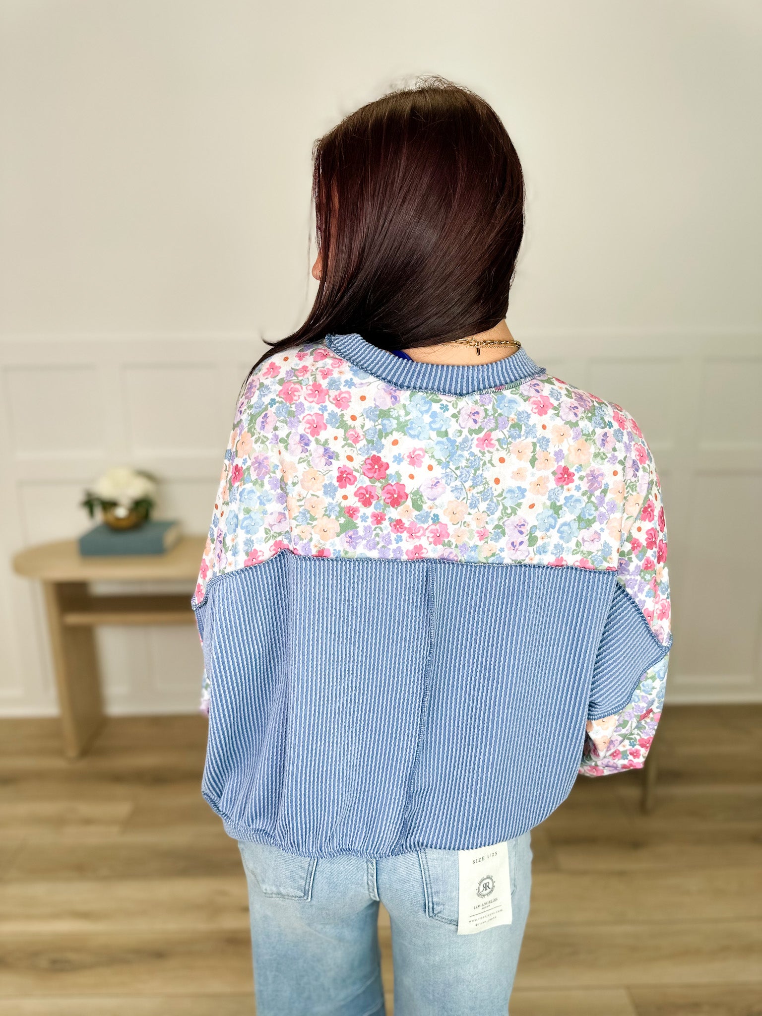 Stuck on You Long Sleeve Blue Top This charming blue long sleeve features delicate ribbed detailing that frames the neckline, hugs the bottom hem, and wraps halfway down the back for a polished finish. A gorgeous floral pattern adds a touch of botanical beauty to this playful piece. Perfect for layering or wearing solo, it's the kind of top that makes you smile every time you put it on. Effortlessly cute and endlessly versatile.