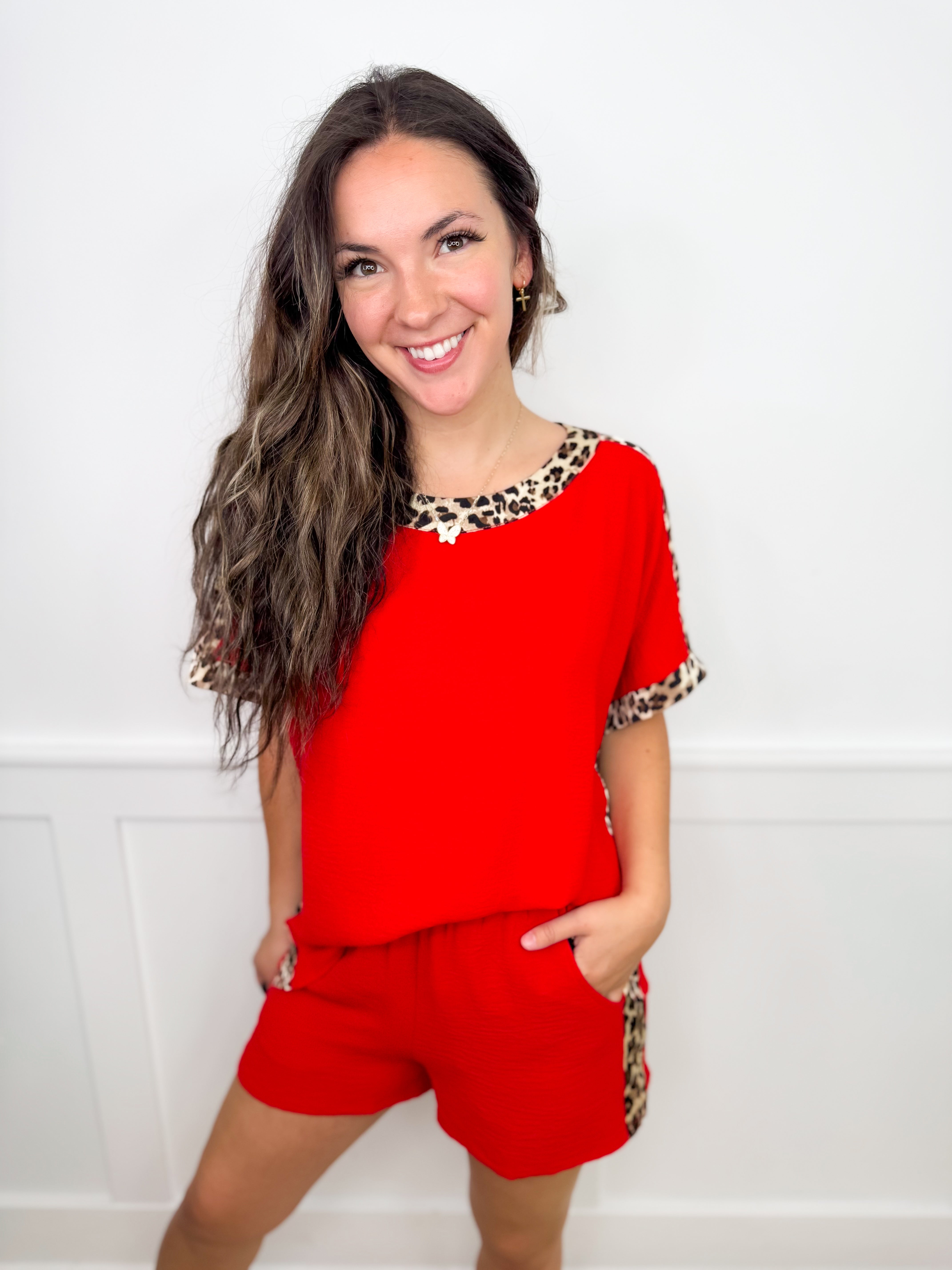 Add a wild touch to your wardrobe with the Wild Summer Lightweight Short Sleeve Red Avery Mae Top. Featuring a playful leopard print hem, this vibrant red top combines comfort and style effortlessly. Perfect for those who love a hint of fierce flair in their everyday look.