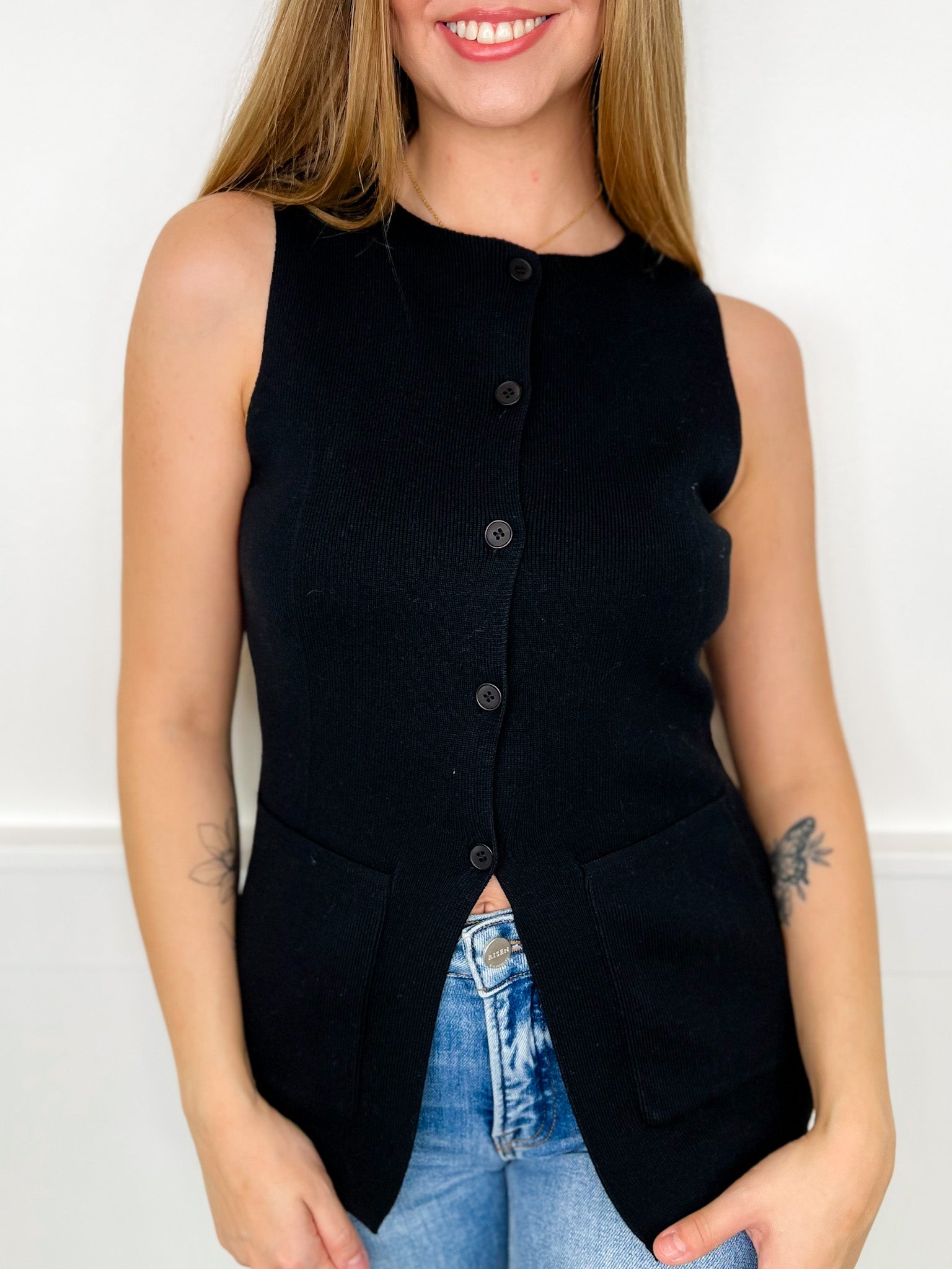 Elevate your outfit with this playful cotton blend knit vest featuring a comfy round neck and a classic button-down front. Perfect for layering, it adds a cozy pop of color in three fun shades, making every look effortlessly chic and snug.