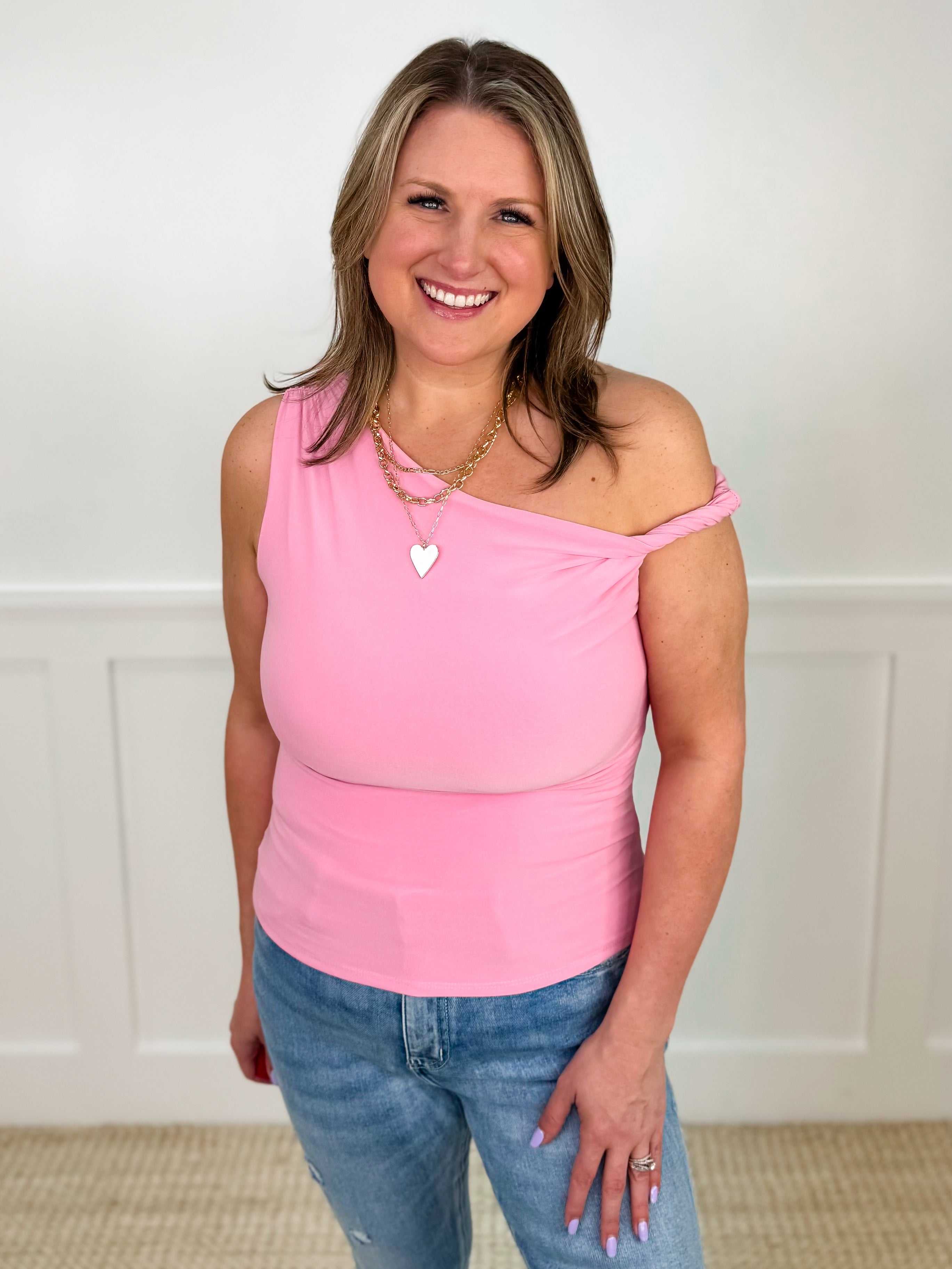 Unleash your feminine charm with the All About the Time Pink Avery Mae Tank Top! Perfect for any occasion, this super cute top features a twisted tank strap for added style. Feel confident and stylish in this gorgeous pink blouse that will elevate your wardrobe.