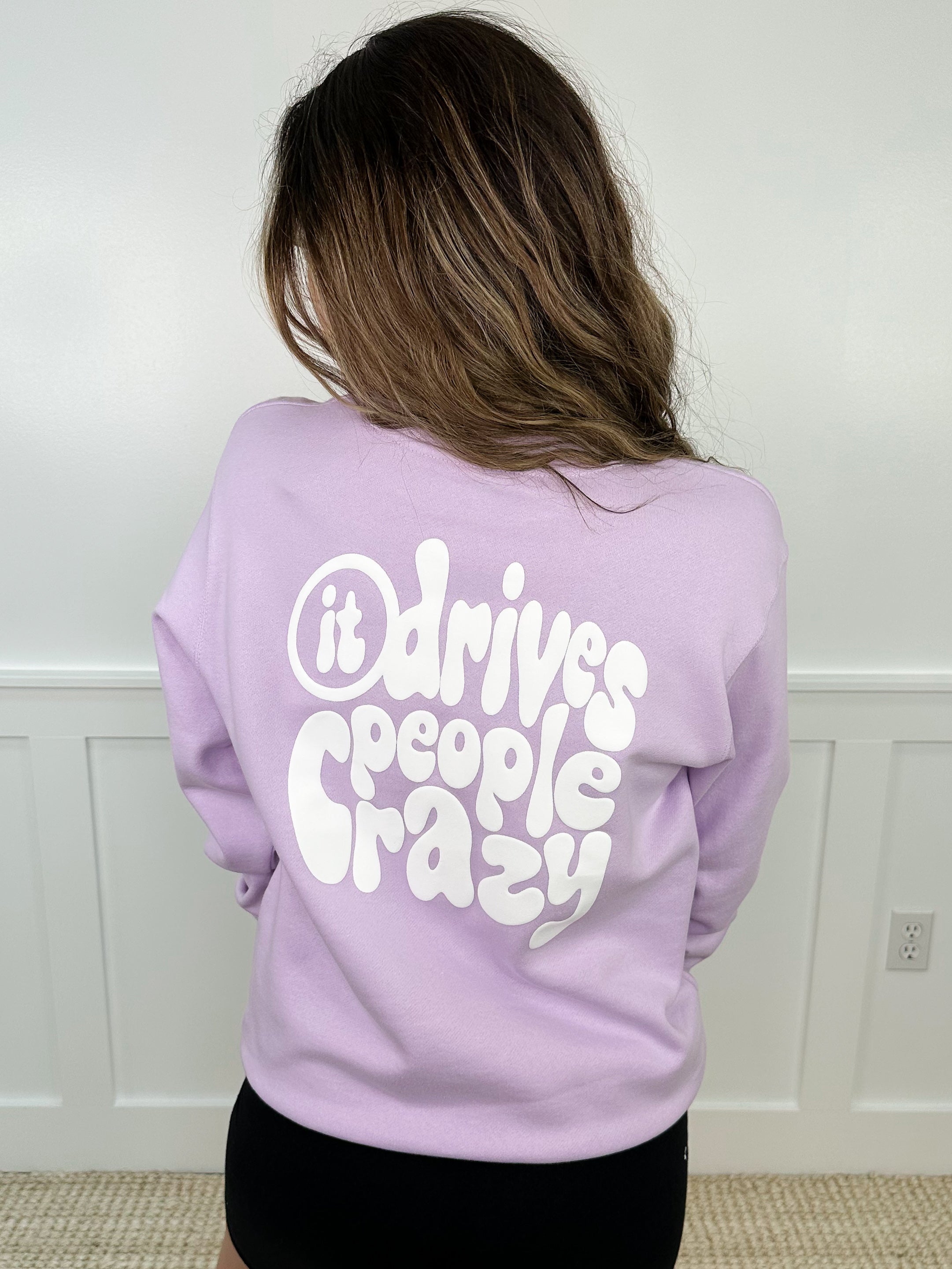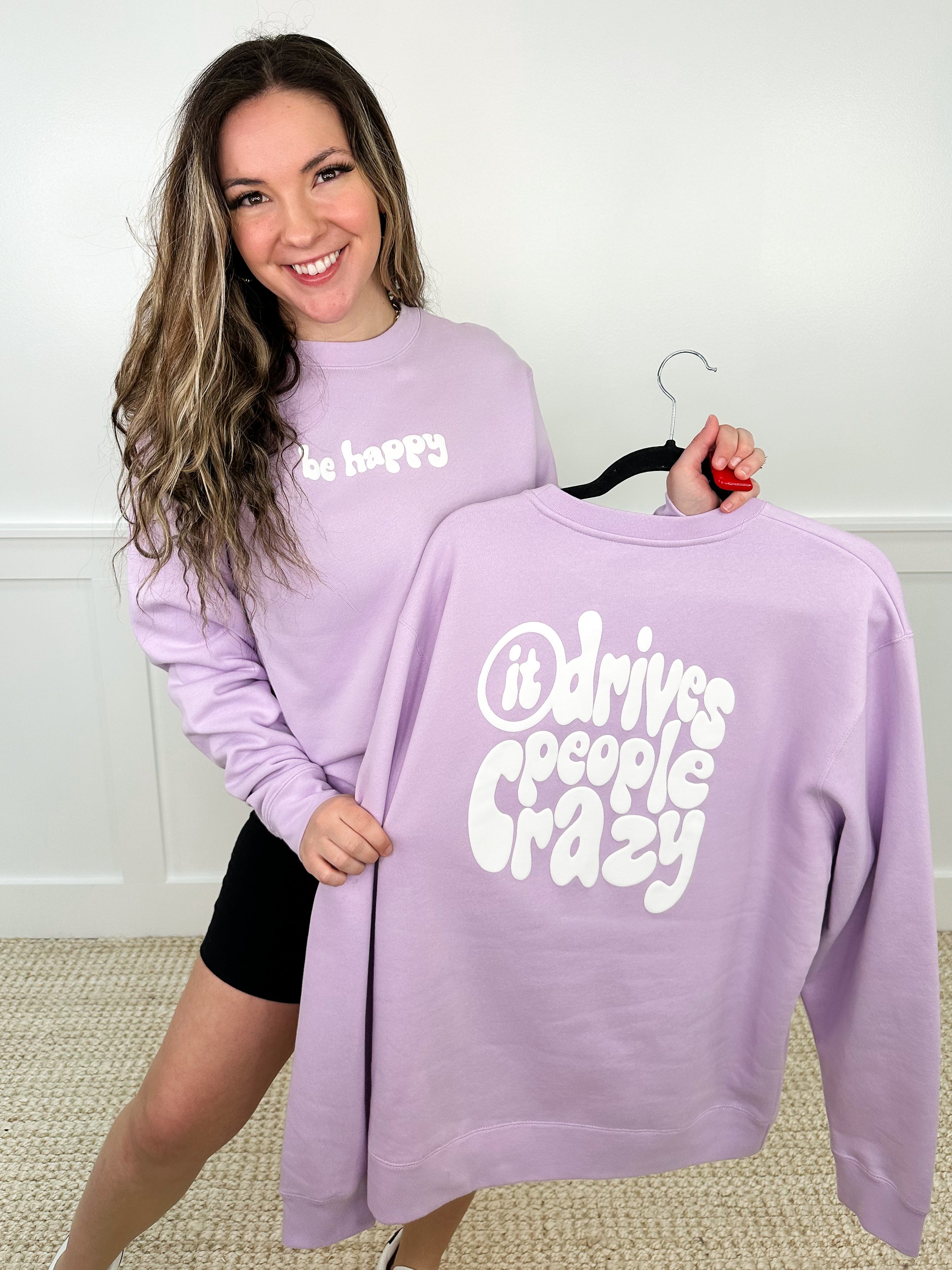 This whimsical sweatshirt, featuring a playful bubble font, will make you smile every time you wear it. The soft fleece lining will keep you cozy, while the cheeky phrase "be happy, it drives people crazy" adds a touch of humor. Stay warm and spread joy with this Avery Mae graphic sweatshirt.