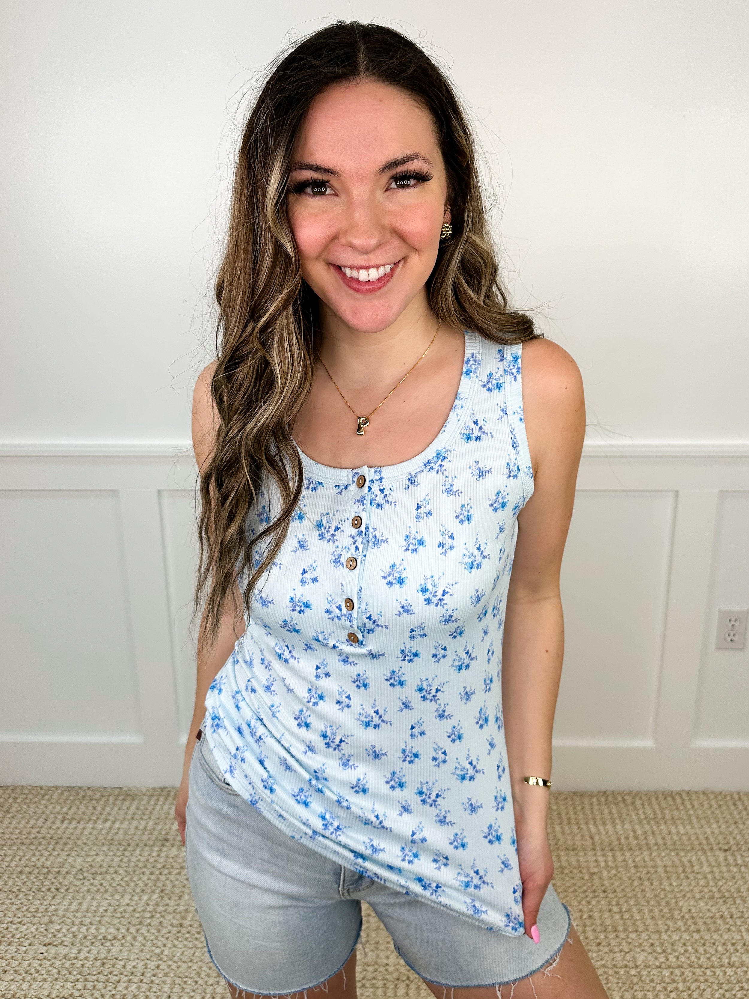 Add some flower power to your wardrobe with the Beautiful Blooming Day Ribbed Blue Avery Mae Tank Top. This fun and functional summer staple features a beautiful blue color and a blooming flower design. Plus, it even has functional front buttons for added style and convenience. A must-have for any summer day!