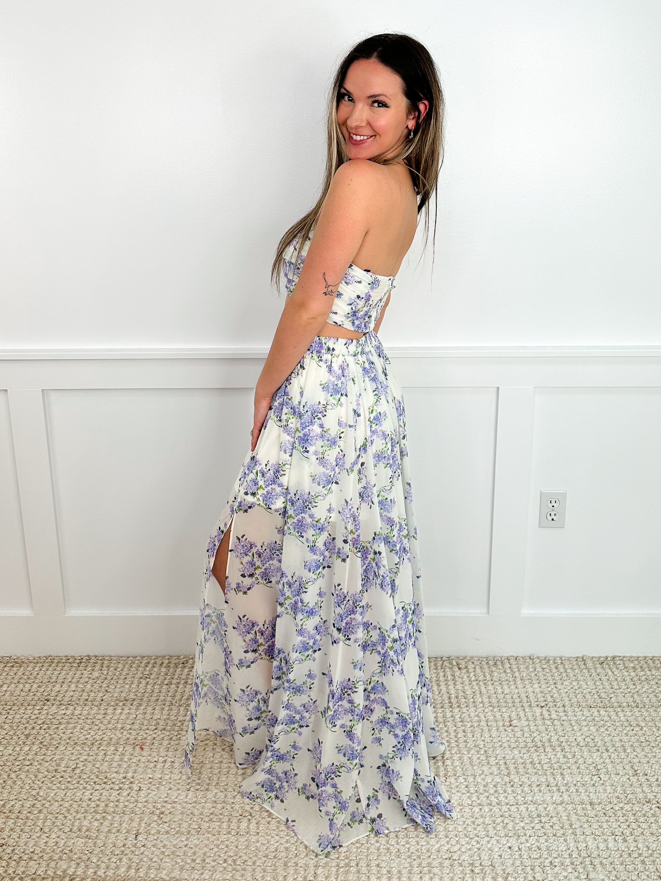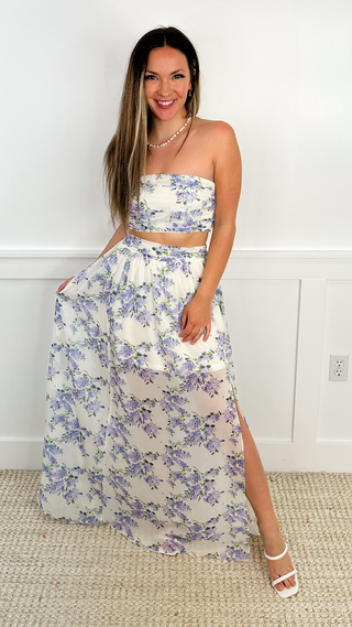 Embrace the beauty of summer with the Beautiful Days Strapless Ivory Avery Mae Skirt Set. This adorable set features delicate lilac flowers on a versatile ivory background. Perfect for any summer day, this set will have you looking and feeling your best.