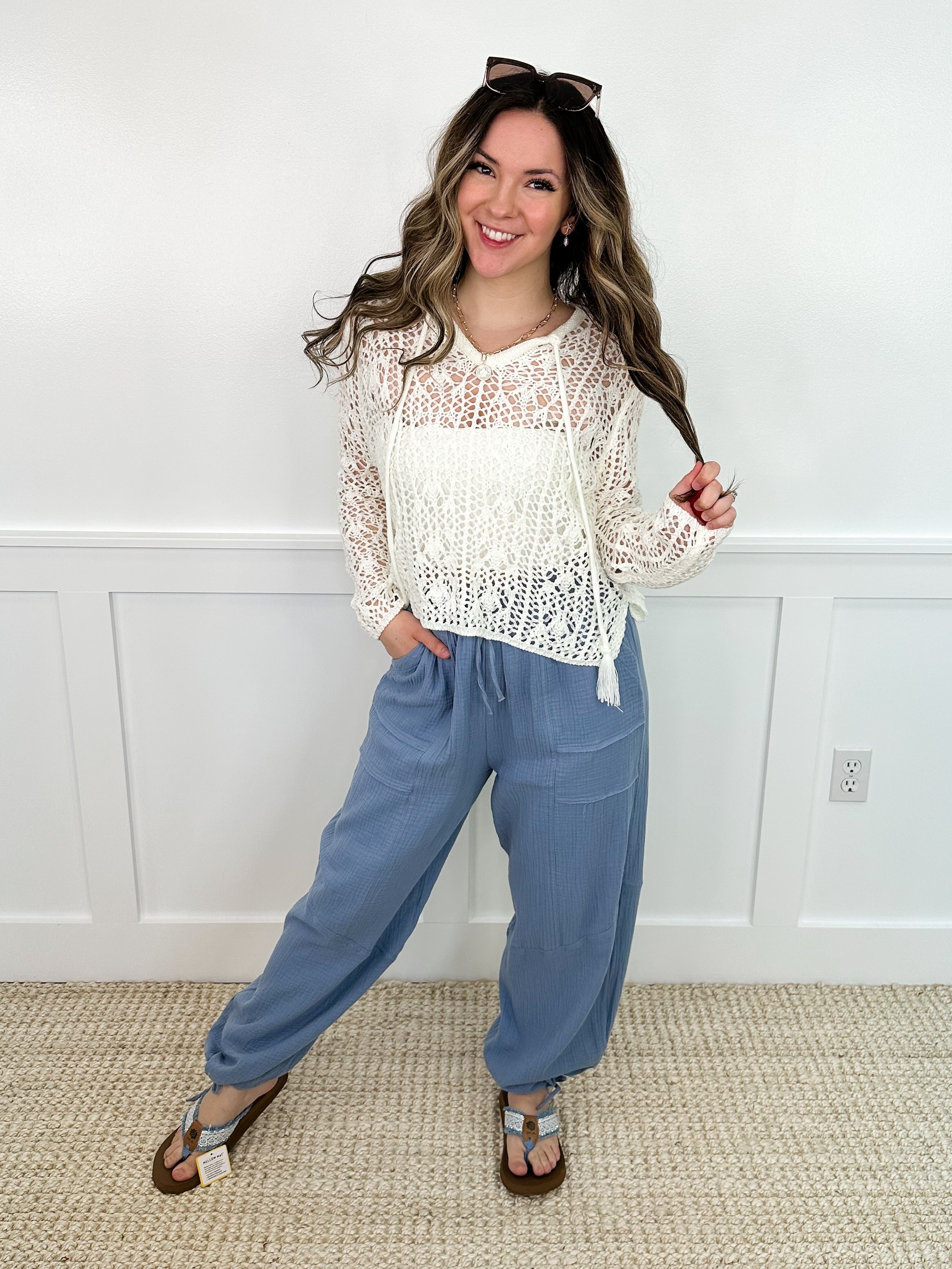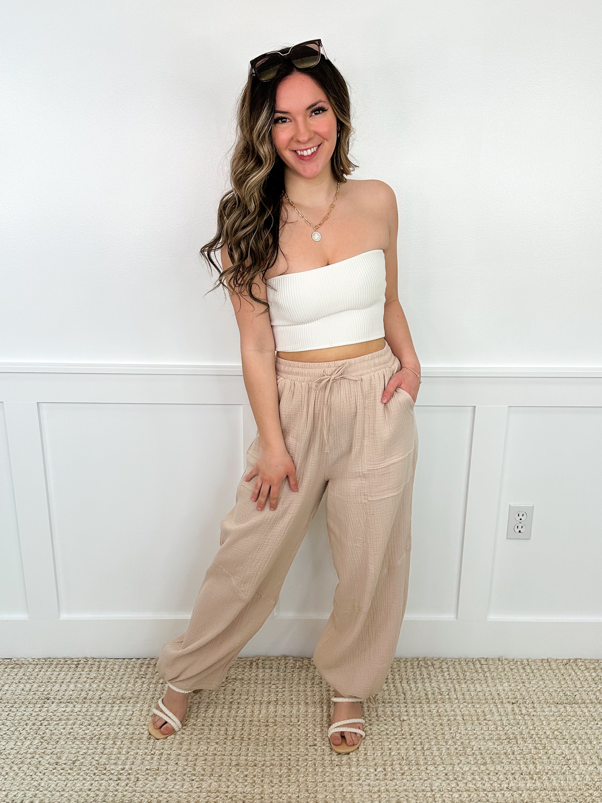 Upgrade your summer wardrobe with our Before the Daylight Cotton High Rise Avery Mae Bottoms! These breezy bottoms feature a lightweight gauzy feel and an elastic waistband with a drawstring for the perfect fit. Plus, the pant leg tie adds a touch of style and versatility. Available in 3 colors for endless outfit options.