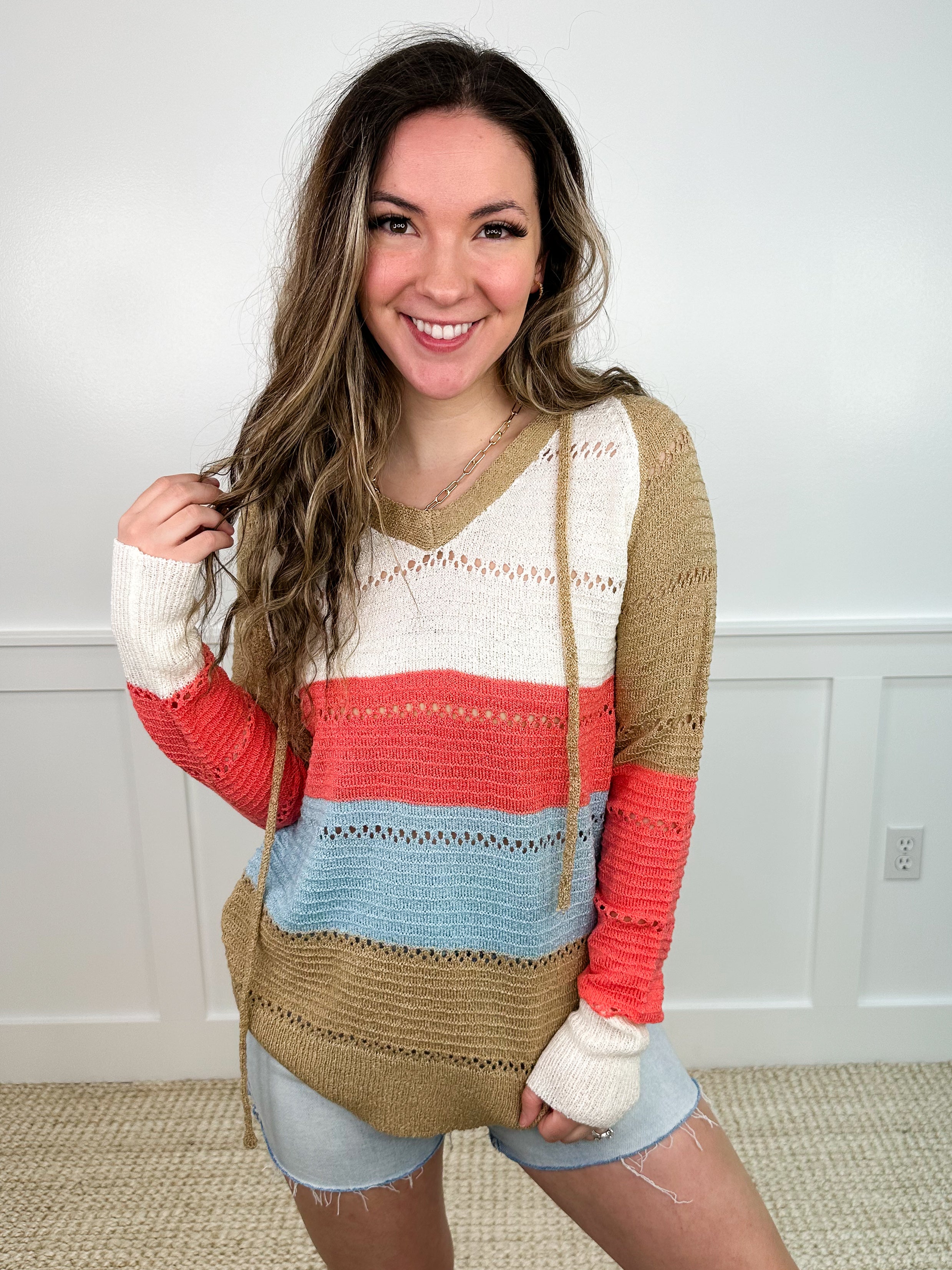 Be bright and comfy with the Bringing Out the Brightness Knit Long Sleeve Tan Avery Mae Hooded Sweater Top. Perfect for any day, this cute and cozy top will elevate your style and keep you feeling great. A must-have addition to your wardrobe!