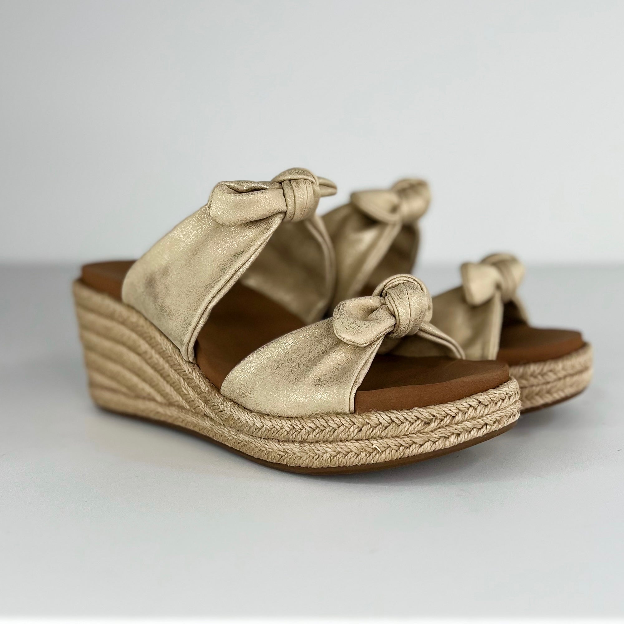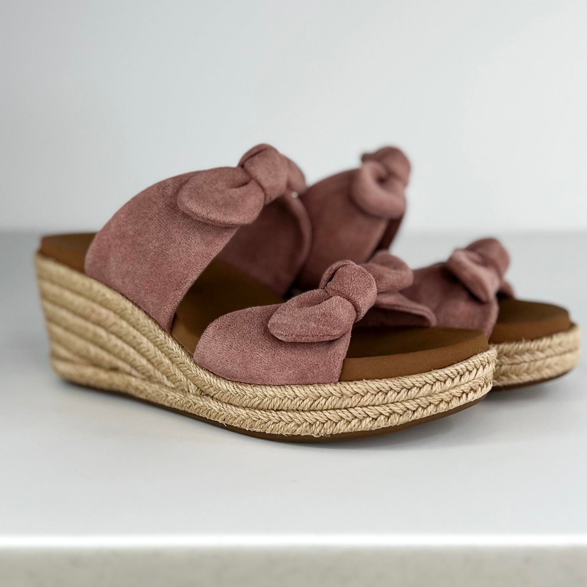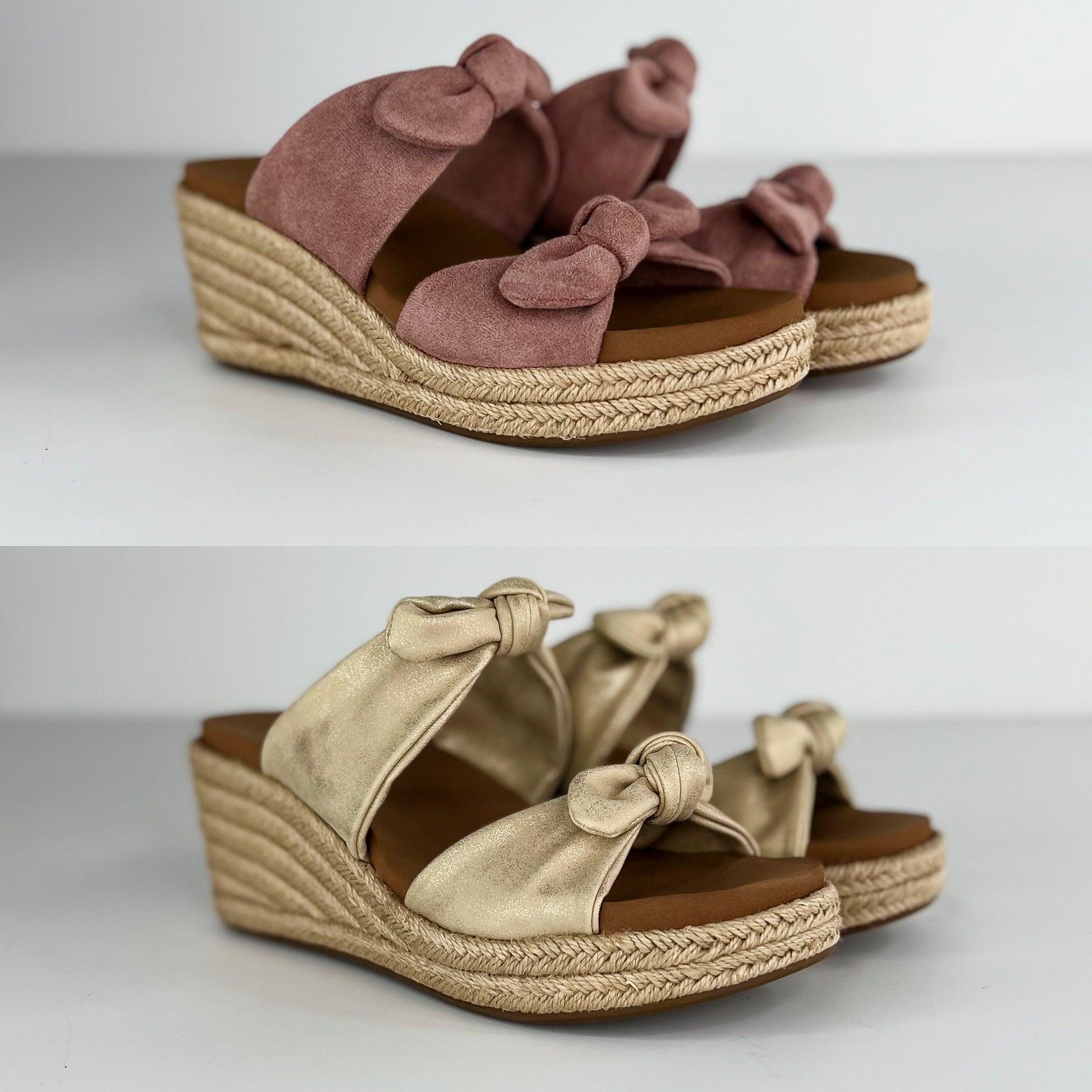 Rock your style game with these Corky Flawless Beauty Wedges! The two bow straps add a touch of cute, while the rope sole base provides comfort and support. Available in gold metallic and pink, these wedges are the perfect addition to any outfit.